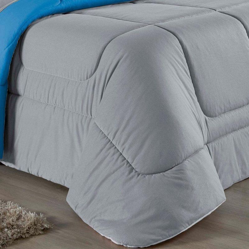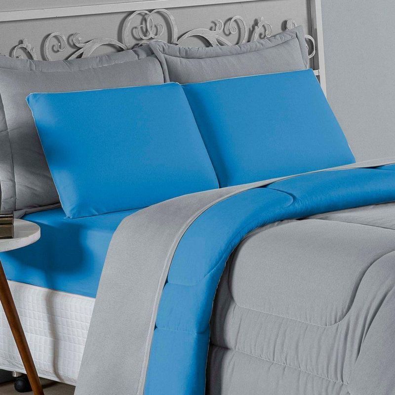 Kit Edredom Dupla Face + Jogo De Lençol Casal Viúva Nobre 6 Peças Malha 100% Algodão - Cinza / TurquesaRenove o quarto das crianças ou de visitas com o Kit Cama Completa Casal Viúva Nobre 6 Peças. Uma solução prática e extremamente confortável que une o aquecimento do edredom, a elegância do porta travesseiro matelado e a suavidade do jogo de lençol em malha 100% algodão. Essa medida especial foi feita para as camas cama casal viúva ou solteiro viúva.Por que este Kit é uma ótima escolha?- Conforto da Malha Penteada: Todas as peças em contato com a pele são feitas em Malha 100% Algodão Fio 30/1 Penteado, garantindo toque macio, frescor e alta durabilidade sem formar bolinhas.- Cama Posta Coordenada: O kit já vem combinando! O edredom dupla face e o porta travesseiro decoram, enquanto o lençol e a fronha vestem o colchão com perfeição.- Praticidade do Elástico: O lençol de baixo possui elástico em toda a volta, facilitando a arrumação diária e garantindo que ele não escape do colchão.- Aconchego Térmico: O edredom com enchimento siliconado oferece o peso e o calor ideais para uma noite de sono tranquila.Produto composto por (Total 06 Peças):Do Kit Edredom (03 Peças):01 Edredom Casal Viúva Dupla Face: 2,00m x 2,20m02 Porta Travesseiro Matelado: 50cm x 70cmDo Jogo de Lençol (03 Peças):01 Lençol Casal Viúva com Elástico 1,28m x 1,98m x 30cm02 Fronha: 70cm x 50cmAtenção: Este kit é composto pelo jogo de cama essencial (lençol com elástico e fronha) e não inclui o lençol de cima (sobre lençol).Composição:Tecido (Todas as peças): Malha 100% Algodão - Fio 30/1 PenteadoEnchimento (Edredom e Porta Travesseiro): 100% Poliéster (Edredom com fibra siliconada)Forro (Apenas Porta Travesseiro): 100% Polipropileno