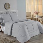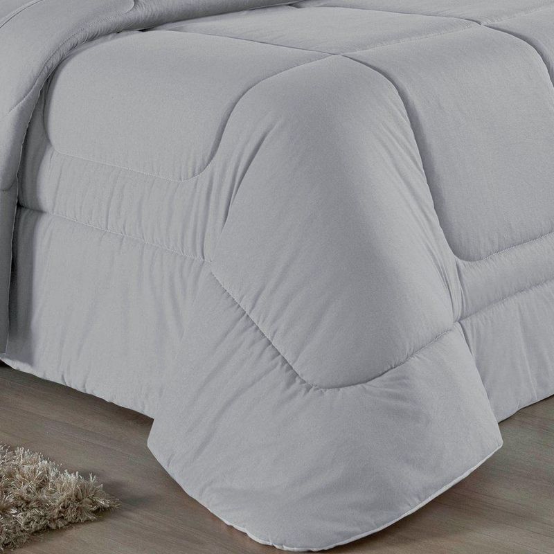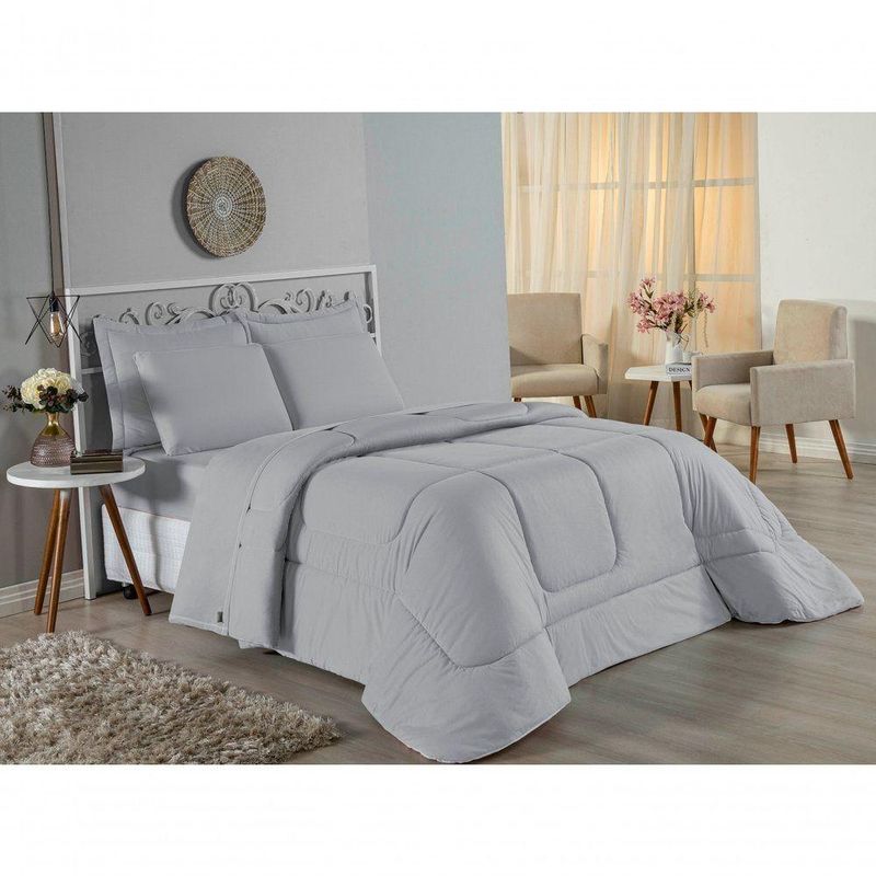 Kit Edredom Dupla Face + Jogo De Lençol Casal Viúva Nobre 6 Peças Malha 100% Algodão - CinzaRenove o quarto das crianças ou de visitas com o Kit Cama Completa Casal Viúva Nobre 6 Peças. Uma solução prática e extremamente confortável que une o aquecimento do edredom, a elegância do porta travesseiro matelado e a suavidade do jogo de lençol em malha 100% algodão. Essa medida especial foi feita para as camas cama casal viúva ou solteiro viúva.Por que este Kit é uma ótima escolha?- Conforto da Malha Penteada: Todas as peças em contato com a pele são feitas em Malha 100% Algodão Fio 30/1 Penteado, garantindo toque macio, frescor e alta durabilidade sem formar bolinhas.- Cama Posta Coordenada: O kit já vem combinando! O edredom dupla face e o porta travesseiro decoram, enquanto o lençol e a fronha vestem o colchão com perfeição.- Praticidade do Elástico: O lençol de baixo possui elástico em toda a volta, facilitando a arrumação diária e garantindo que ele não escape do colchão.- Aconchego Térmico: O edredom com enchimento siliconado oferece o peso e o calor ideais para uma noite de sono tranquila.Produto composto por (Total 06 Peças):Do Kit Edredom (03 Peças):01 Edredom Casal Viúva Dupla Face: 2,00m x 2,20m02 Porta Travesseiro Matelado: 50cm x 70cmDo Jogo de Lençol (03 Peças):01 Lençol Casal Viúva com Elástico 1,28m x 1,98m x 30cm02 Fronha: 70cm x 50cmAtenção: Este kit é composto pelo jogo de cama essencial (lençol com elástico e fronha) e não inclui o lençol de cima (sobre lençol).Composição:Tecido (Todas as peças): Malha 100% Algodão - Fio 30/1 PenteadoEnchimento (Edredom e Porta Travesseiro): 100% Poliéster (Edredom com fibra siliconada)Forro (Apenas Porta Travesseiro): 100% Polipropileno