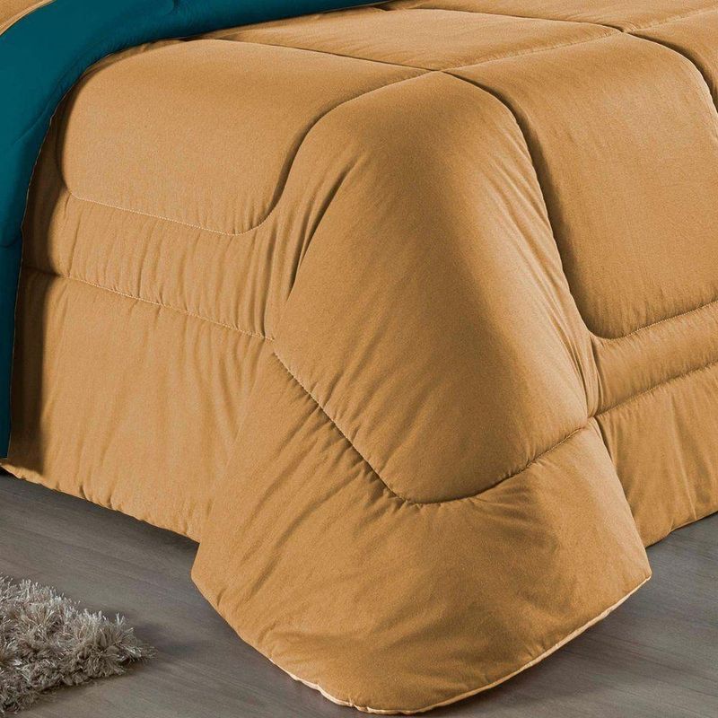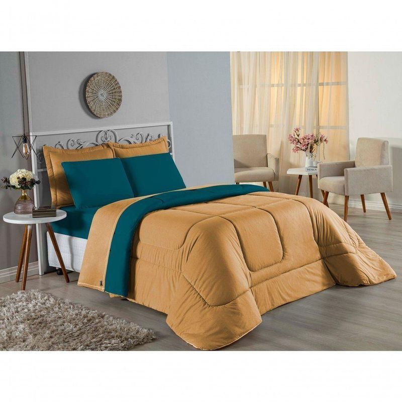 Kit Edredom Dupla Face + Jogo De Lençol Casal Viúva Nobre 6 Peças Malha 100% Algodão - Cobre / PetróleoRenove o quarto das crianças ou de visitas com o Kit Cama Completa Casal Viúva Nobre 6 Peças. Uma solução prática e extremamente confortável que une o aquecimento do edredom, a elegância do porta travesseiro matelado e a suavidade do jogo de lençol em malha 100% algodão. Essa medida especial foi feita para as camas cama casal viúva ou solteiro viúva.Por que este Kit é uma ótima escolha?- Conforto da Malha Penteada: Todas as peças em contato com a pele são feitas em Malha 100% Algodão Fio 30/1 Penteado, garantindo toque macio, frescor e alta durabilidade sem formar bolinhas.- Cama Posta Coordenada: O kit já vem combinando! O edredom dupla face e o porta travesseiro decoram, enquanto o lençol e a fronha vestem o colchão com perfeição.- Praticidade do Elástico: O lençol de baixo possui elástico em toda a volta, facilitando a arrumação diária e garantindo que ele não escape do colchão.- Aconchego Térmico: O edredom com enchimento siliconado oferece o peso e o calor ideais para uma noite de sono tranquila.Produto composto por (Total 06 Peças):Do Kit Edredom (03 Peças):01 Edredom Casal Viúva Dupla Face: 2,00m x 2,20m02 Porta Travesseiro Matelado: 50cm x 70cmDo Jogo de Lençol (03 Peças):01 Lençol Casal Viúva com Elástico 1,28m x 1,98m x 30cm02 Fronha: 70cm x 50cmAtenção: Este kit é composto pelo jogo de cama essencial (lençol com elástico e fronha) e não inclui o lençol de cima (sobre lençol).Composição:Tecido (Todas as peças): Malha 100% Algodão - Fio 30/1 PenteadoEnchimento (Edredom e Porta Travesseiro): 100% Poliéster (Edredom com fibra siliconada)Forro (Apenas Porta Travesseiro): 100% Polipropileno
