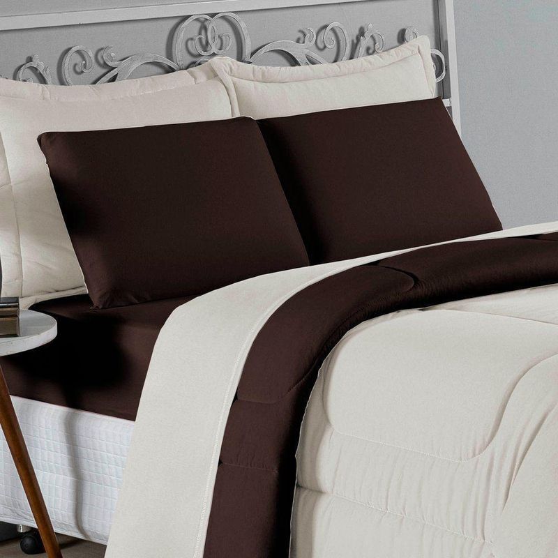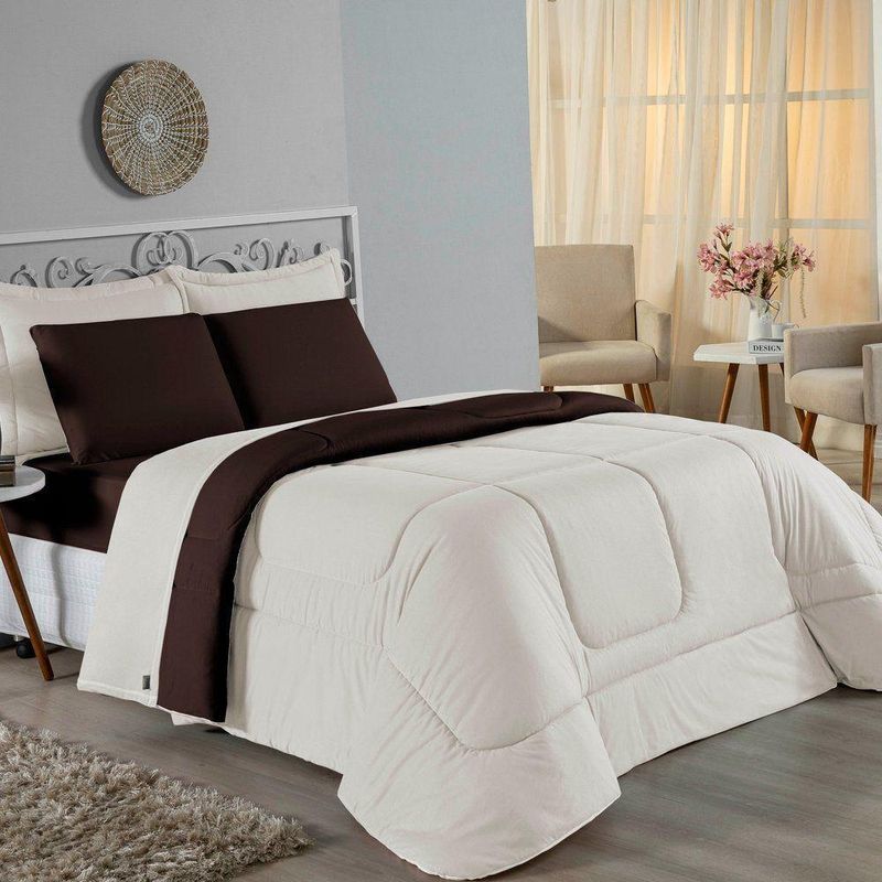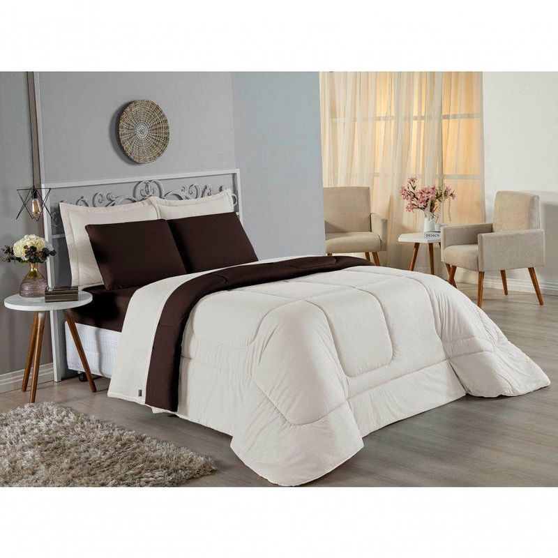 Kit Edredom Dupla Face + Jogo De Lençol Casal Viúva Nobre 6 Peças Malha 100% Algodão - Palha / MarromRenove o quarto das crianças ou de visitas com o Kit Cama Completa Casal Viúva Nobre 6 Peças. Uma solução prática e extremamente confortável que une o aquecimento do edredom, a elegância do porta travesseiro matelado e a suavidade do jogo de lençol em malha 100% algodão. Essa medida especial foi feita para as camas cama casal viúva ou solteiro viúva.Por que este Kit é uma ótima escolha?- Conforto da Malha Penteada: Todas as peças em contato com a pele são feitas em Malha 100% Algodão Fio 30/1 Penteado, garantindo toque macio, frescor e alta durabilidade sem formar bolinhas.- Cama Posta Coordenada: O kit já vem combinando! O edredom dupla face e o porta travesseiro decoram, enquanto o lençol e a fronha vestem o colchão com perfeição.- Praticidade do Elástico: O lençol de baixo possui elástico em toda a volta, facilitando a arrumação diária e garantindo que ele não escape do colchão.- Aconchego Térmico: O edredom com enchimento siliconado oferece o peso e o calor ideais para uma noite de sono tranquila.Produto composto por (Total 06 Peças):Do Kit Edredom (03 Peças):01 Edredom Casal Viúva Dupla Face: 2,00m x 2,20m02 Porta Travesseiro Matelado: 50cm x 70cmDo Jogo de Lençol (03 Peças):01 Lençol Casal Viúva com Elástico 1,28m x 1,98m x 30cm02 Fronha: 70cm x 50cmAtenção: Este kit é composto pelo jogo de cama essencial (lençol com elástico e fronha) e não inclui o lençol de cima (sobre lençol).Composição:Tecido (Todas as peças): Malha 100% Algodão - Fio 30/1 PenteadoEnchimento (Edredom e Porta Travesseiro): 100% Poliéster (Edredom com fibra siliconada)Forro (Apenas Porta Travesseiro): 100% Polipropileno