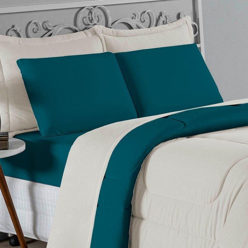 Kit Edredom Dupla Face + Jogo De Lençol Casal Viúva Nobre 6 Peças Malha 100% Algodão - Palha / PetróleoRenove o quarto das crianças ou de visitas com o Kit Cama Completa Casal Viúva Nobre 6 Peças. Uma solução prática e extremamente confortável que une o aquecimento do edredom, a elegância do porta travesseiro matelado e a suavidade do jogo de lençol em malha 100% algodão. Essa medida especial foi feita para as camas cama casal viúva ou solteiro viúva.Por que este Kit é uma ótima escolha?- Conforto da Malha Penteada: Todas as peças em contato com a pele são feitas em Malha 100% Algodão Fio 30/1 Penteado, garantindo toque macio, frescor e alta durabilidade sem formar bolinhas.- Cama Posta Coordenada: O kit já vem combinando! O edredom dupla face e o porta travesseiro decoram, enquanto o lençol e a fronha vestem o colchão com perfeição.- Praticidade do Elástico: O lençol de baixo possui elástico em toda a volta, facilitando a arrumação diária e garantindo que ele não escape do colchão.- Aconchego Térmico: O edredom com enchimento siliconado oferece o peso e o calor ideais para uma noite de sono tranquila.Produto composto por (Total 06 Peças):Do Kit Edredom (03 Peças):01 Edredom Casal Viúva Dupla Face: 2,00m x 2,20m02 Porta Travesseiro Matelado: 50cm x 70cmDo Jogo de Lençol (03 Peças):01 Lençol Casal Viúva com Elástico 1,28m x 1,98m x 30cm02 Fronha: 70cm x 50cmAtenção: Este kit é composto pelo jogo de cama essencial (lençol com elástico e fronha) e não inclui o lençol de cima (sobre lençol).Composição:Tecido (Todas as peças): Malha 100% Algodão - Fio 30/1 PenteadoEnchimento (Edredom e Porta Travesseiro): 100% Poliéster (Edredom com fibra siliconada)Forro (Apenas Porta Travesseiro): 100% Polipropileno
