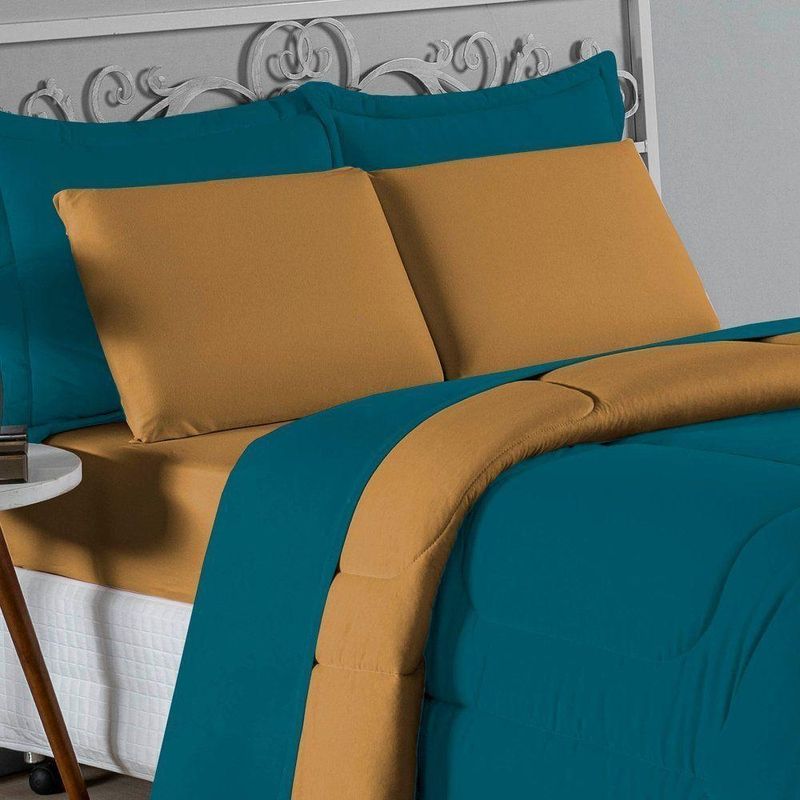 Kit Edredom Dupla Face + Jogo De Lençol Casal Viúva Nobre 6 Peças Malha 100% Algodão - Petróleo / CobreRenove o quarto das crianças ou de visitas com o Kit Cama Completa Casal Viúva Nobre 6 Peças. Uma solução prática e extremamente confortável que une o aquecimento do edredom, a elegância do porta travesseiro matelado e a suavidade do jogo de lençol em malha 100% algodão. Essa medida especial foi feita para as camas cama casal viúva ou solteiro viúva.Por que este Kit é uma ótima escolha?- Conforto da Malha Penteada: Todas as peças em contato com a pele são feitas em Malha 100% Algodão Fio 30/1 Penteado, garantindo toque macio, frescor e alta durabilidade sem formar bolinhas.- Cama Posta Coordenada: O kit já vem combinando! O edredom dupla face e o porta travesseiro decoram, enquanto o lençol e a fronha vestem o colchão com perfeição.- Praticidade do Elástico: O lençol de baixo possui elástico em toda a volta, facilitando a arrumação diária e garantindo que ele não escape do colchão.- Aconchego Térmico: O edredom com enchimento siliconado oferece o peso e o calor ideais para uma noite de sono tranquila.Produto composto por (Total 06 Peças):Do Kit Edredom (03 Peças):01 Edredom Casal Viúva Dupla Face: 2,00m x 2,20m02 Porta Travesseiro Matelado: 50cm x 70cmDo Jogo de Lençol (03 Peças):01 Lençol Casal Viúva com Elástico 1,28m x 1,98m x 30cm02 Fronha: 70cm x 50cmAtenção: Este kit é composto pelo jogo de cama essencial (lençol com elástico e fronha) e não inclui o lençol de cima (sobre lençol).Composição:Tecido (Todas as peças): Malha 100% Algodão - Fio 30/1 PenteadoEnchimento (Edredom e Porta Travesseiro): 100% Poliéster (Edredom com fibra siliconada)Forro (Apenas Porta Travesseiro): 100% Polipropileno