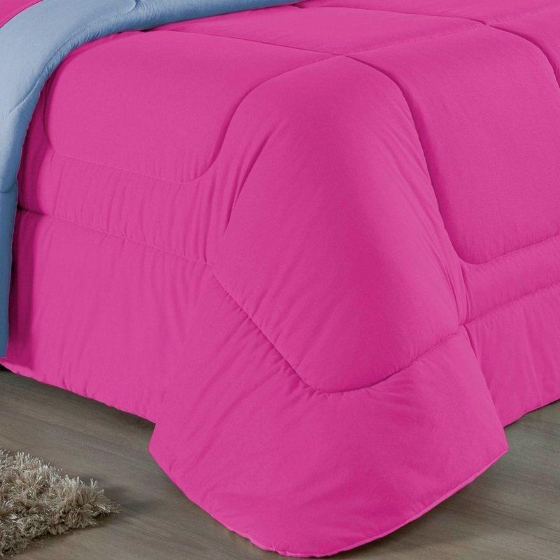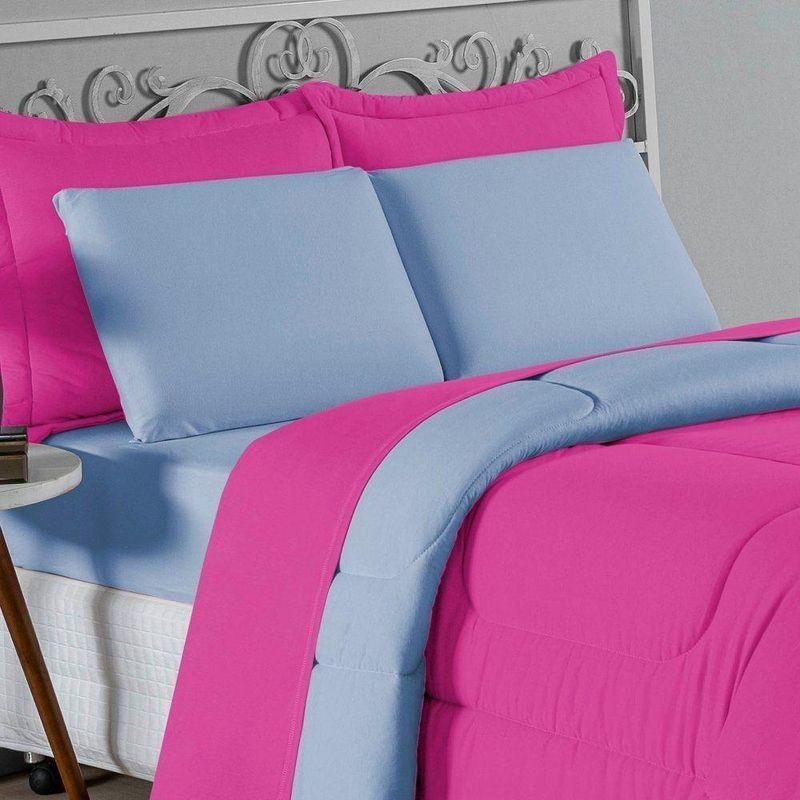 Kit Edredom Dupla Face + Jogo De Lençol Casal Viúva Nobre 6 Peças Malha 100% Algodão - Pink / Azul-bebêRenove o quarto das crianças ou de visitas com o Kit Cama Completa Casal Viúva Nobre 6 Peças. Uma solução prática e extremamente confortável que une o aquecimento do edredom, a elegância do porta travesseiro matelado e a suavidade do jogo de lençol em malha 100% algodão. Essa medida especial foi feita para as camas cama casal viúva ou solteiro viúva.Por que este Kit é uma ótima escolha?- Conforto da Malha Penteada: Todas as peças em contato com a pele são feitas em Malha 100% Algodão Fio 30/1 Penteado, garantindo toque macio, frescor e alta durabilidade sem formar bolinhas.- Cama Posta Coordenada: O kit já vem combinando! O edredom dupla face e o porta travesseiro decoram, enquanto o lençol e a fronha vestem o colchão com perfeição.- Praticidade do Elástico: O lençol de baixo possui elástico em toda a volta, facilitando a arrumação diária e garantindo que ele não escape do colchão.- Aconchego Térmico: O edredom com enchimento siliconado oferece o peso e o calor ideais para uma noite de sono tranquila.Produto composto por (Total 06 Peças):Do Kit Edredom (03 Peças):01 Edredom Casal Viúva Dupla Face: 2,00m x 2,20m02 Porta Travesseiro Matelado: 50cm x 70cmDo Jogo de Lençol (03 Peças):01 Lençol Casal Viúva com Elástico 1,28m x 1,98m x 30cm02 Fronha: 70cm x 50cmAtenção: Este kit é composto pelo jogo de cama essencial (lençol com elástico e fronha) e não inclui o lençol de cima (sobre lençol).Composição:Tecido (Todas as peças): Malha 100% Algodão - Fio 30/1 PenteadoEnchimento (Edredom e Porta Travesseiro): 100% Poliéster (Edredom com fibra siliconada)Forro (Apenas Porta Travesseiro): 100% Polipropileno