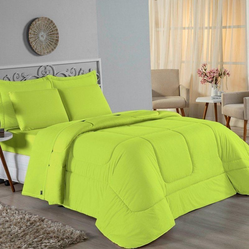 Kit Edredom Dupla Face + Jogo De Lençol Casal Viúva Nobre 6 Peças Malha 100% Algodão - PistacheRenove o quarto das crianças ou de visitas com o Kit Cama Completa Casal Viúva Nobre 6 Peças. Uma solução prática e extremamente confortável que une o aquecimento do edredom, a elegância do porta travesseiro matelado e a suavidade do jogo de lençol em malha 100% algodão. Essa medida especial foi feita para as camas cama casal viúva ou solteiro viúva.Por que este Kit é uma ótima escolha?- Conforto da Malha Penteada: Todas as peças em contato com a pele são feitas em Malha 100% Algodão Fio 30/1 Penteado, garantindo toque macio, frescor e alta durabilidade sem formar bolinhas.- Cama Posta Coordenada: O kit já vem combinando! O edredom dupla face e o porta travesseiro decoram, enquanto o lençol e a fronha vestem o colchão com perfeição.- Praticidade do Elástico: O lençol de baixo possui elástico em toda a volta, facilitando a arrumação diária e garantindo que ele não escape do colchão.- Aconchego Térmico: O edredom com enchimento siliconado oferece o peso e o calor ideais para uma noite de sono tranquila.Produto composto por (Total 06 Peças):Do Kit Edredom (03 Peças):01 Edredom Casal Viúva Dupla Face: 2,00m x 2,20m02 Porta Travesseiro Matelado: 50cm x 70cmDo Jogo de Lençol (03 Peças):01 Lençol Casal Viúva com Elástico 1,28m x 1,98m x 30cm02 Fronha: 70cm x 50cmAtenção: Este kit é composto pelo jogo de cama essencial (lençol com elástico e fronha) e não inclui o lençol de cima (sobre lençol).Composição:Tecido (Todas as peças): Malha 100% Algodão - Fio 30/1 PenteadoEnchimento (Edredom e Porta Travesseiro): 100% Poliéster (Edredom com fibra siliconada)Forro (Apenas Porta Travesseiro): 100% Polipropileno