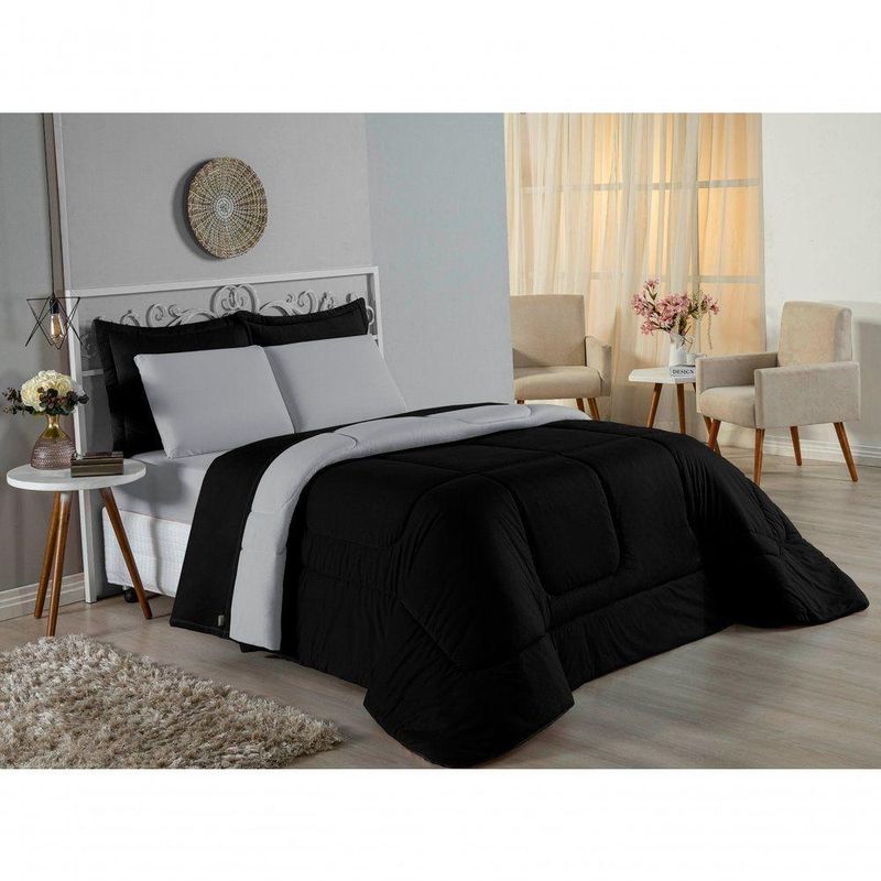 Kit Edredom Dupla Face + Jogo De Lençol Casal Viúva Nobre 6 Peças Malha 100% Algodão - Preto / CinzaRenove o quarto das crianças ou de visitas com o Kit Cama Completa Casal Viúva Nobre 6 Peças. Uma solução prática e extremamente confortável que une o aquecimento do edredom, a elegância do porta travesseiro matelado e a suavidade do jogo de lençol em malha 100% algodão. Essa medida especial foi feita para as camas cama casal viúva ou solteiro viúva.Por que este Kit é uma ótima escolha?- Conforto da Malha Penteada: Todas as peças em contato com a pele são feitas em Malha 100% Algodão Fio 30/1 Penteado, garantindo toque macio, frescor e alta durabilidade sem formar bolinhas.- Cama Posta Coordenada: O kit já vem combinando! O edredom dupla face e o porta travesseiro decoram, enquanto o lençol e a fronha vestem o colchão com perfeição.- Praticidade do Elástico: O lençol de baixo possui elástico em toda a volta, facilitando a arrumação diária e garantindo que ele não escape do colchão.- Aconchego Térmico: O edredom com enchimento siliconado oferece o peso e o calor ideais para uma noite de sono tranquila.Produto composto por (Total 06 Peças):Do Kit Edredom (03 Peças):01 Edredom Casal Viúva Dupla Face: 2,00m x 2,20m02 Porta Travesseiro Matelado: 50cm x 70cmDo Jogo de Lençol (03 Peças):01 Lençol Casal Viúva com Elástico 1,28m x 1,98m x 30cm02 Fronha: 70cm x 50cmAtenção: Este kit é composto pelo jogo de cama essencial (lençol com elástico e fronha) e não inclui o lençol de cima (sobre lençol).Composição:Tecido (Todas as peças): Malha 100% Algodão - Fio 30/1 PenteadoEnchimento (Edredom e Porta Travesseiro): 100% Poliéster (Edredom com fibra siliconada)Forro (Apenas Porta Travesseiro): 100% Polipropileno