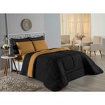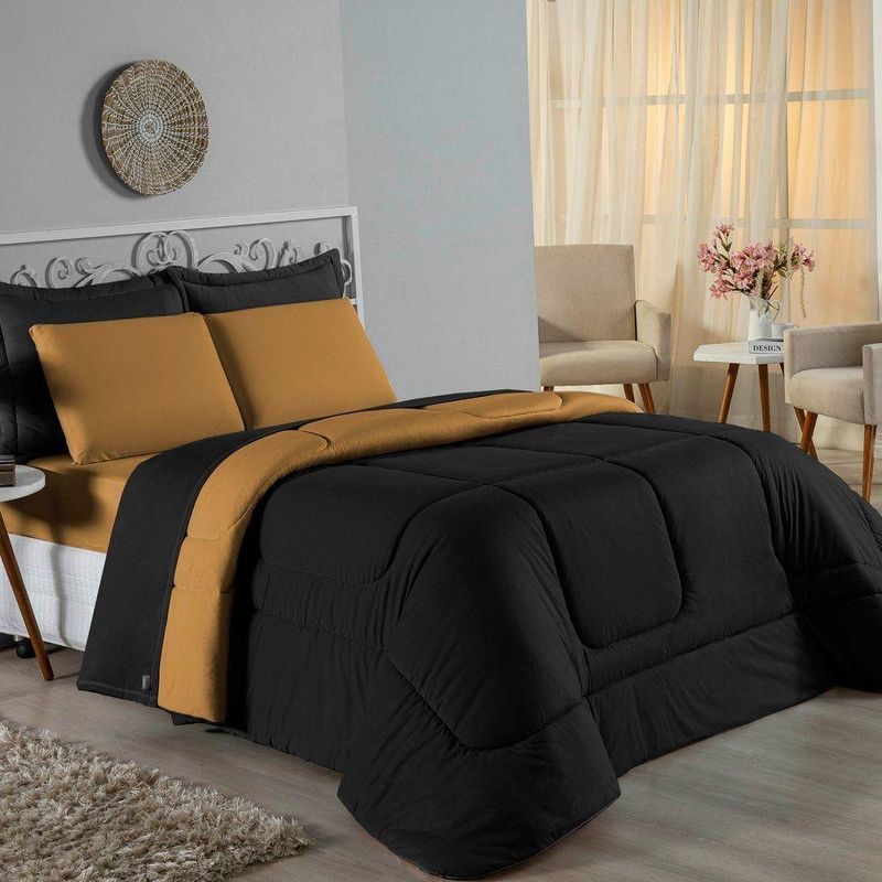 Kit Edredom Dupla Face + Jogo De Lençol Casal Viúva Nobre 6 Peças Malha 100% Algodão - Preto / CobreRenove o quarto das crianças ou de visitas com o Kit Cama Completa Casal Viúva Nobre 6 Peças. Uma solução prática e extremamente confortável que une o aquecimento do edredom, a elegância do porta travesseiro matelado e a suavidade do jogo de lençol em malha 100% algodão. Essa medida especial foi feita para as camas cama casal viúva ou solteiro viúva.Por que este Kit é uma ótima escolha?- Conforto da Malha Penteada: Todas as peças em contato com a pele são feitas em Malha 100% Algodão Fio 30/1 Penteado, garantindo toque macio, frescor e alta durabilidade sem formar bolinhas.- Cama Posta Coordenada: O kit já vem combinando! O edredom dupla face e o porta travesseiro decoram, enquanto o lençol e a fronha vestem o colchão com perfeição.- Praticidade do Elástico: O lençol de baixo possui elástico em toda a volta, facilitando a arrumação diária e garantindo que ele não escape do colchão.- Aconchego Térmico: O edredom com enchimento siliconado oferece o peso e o calor ideais para uma noite de sono tranquila.Produto composto por (Total 06 Peças):Do Kit Edredom (03 Peças):01 Edredom Casal Viúva Dupla Face: 2,00m x 2,20m02 Porta Travesseiro Matelado: 50cm x 70cmDo Jogo de Lençol (03 Peças):01 Lençol Casal Viúva com Elástico 1,28m x 1,98m x 30cm02 Fronha: 70cm x 50cmAtenção: Este kit é composto pelo jogo de cama essencial (lençol com elástico e fronha) e não inclui o lençol de cima (sobre lençol).Composição:Tecido (Todas as peças): Malha 100% Algodão - Fio 30/1 PenteadoEnchimento (Edredom e Porta Travesseiro): 100% Poliéster (Edredom com fibra siliconada)Forro (Apenas Porta Travesseiro): 100% Polipropileno