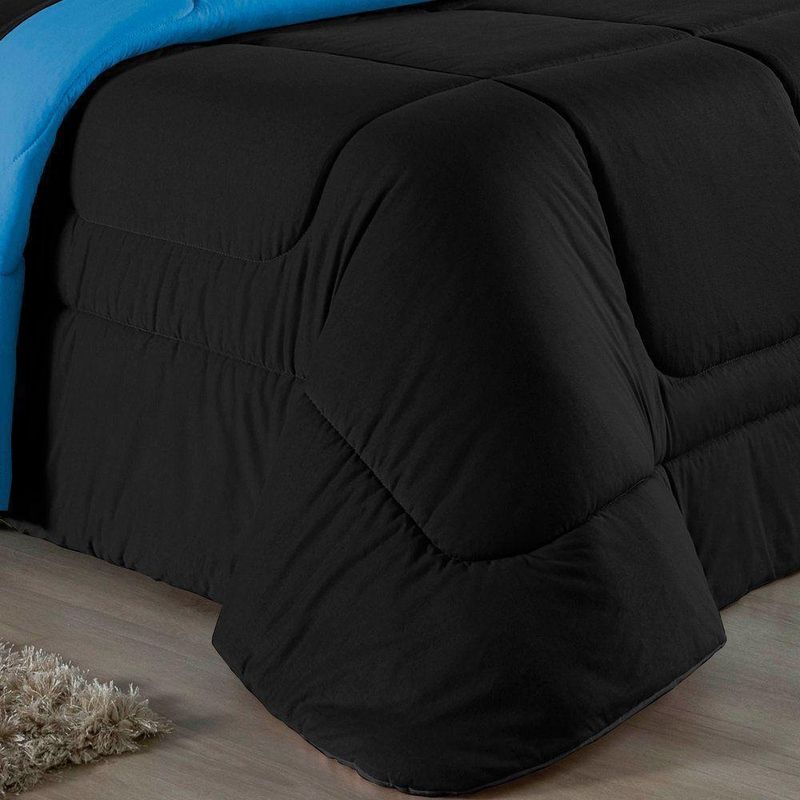 Kit Edredom Dupla Face + Jogo De Lençol Casal Viúva Nobre 6 Peças Malha 100% Algodão - Preto / TurquesaRenove o quarto das crianças ou de visitas com o Kit Cama Completa Casal Viúva Nobre 6 Peças. Uma solução prática e extremamente confortável que une o aquecimento do edredom, a elegância do porta travesseiro matelado e a suavidade do jogo de lençol em malha 100% algodão. Essa medida especial foi feita para as camas cama casal viúva ou solteiro viúva.Por que este Kit é uma ótima escolha?- Conforto da Malha Penteada: Todas as peças em contato com a pele são feitas em Malha 100% Algodão Fio 30/1 Penteado, garantindo toque macio, frescor e alta durabilidade sem formar bolinhas.- Cama Posta Coordenada: O kit já vem combinando! O edredom dupla face e o porta travesseiro decoram, enquanto o lençol e a fronha vestem o colchão com perfeição.- Praticidade do Elástico: O lençol de baixo possui elástico em toda a volta, facilitando a arrumação diária e garantindo que ele não escape do colchão.- Aconchego Térmico: O edredom com enchimento siliconado oferece o peso e o calor ideais para uma noite de sono tranquila.Produto composto por (Total 06 Peças):Do Kit Edredom (03 Peças):01 Edredom Casal Viúva Dupla Face: 2,00m x 2,20m02 Porta Travesseiro Matelado: 50cm x 70cmDo Jogo de Lençol (03 Peças):01 Lençol Casal Viúva com Elástico 1,28m x 1,98m x 30cm02 Fronha: 70cm x 50cmAtenção: Este kit é composto pelo jogo de cama essencial (lençol com elástico e fronha) e não inclui o lençol de cima (sobre lençol).Composição:Tecido (Todas as peças): Malha 100% Algodão - Fio 30/1 PenteadoEnchimento (Edredom e Porta Travesseiro): 100% Poliéster (Edredom com fibra siliconada)Forro (Apenas Porta Travesseiro): 100% Polipropileno