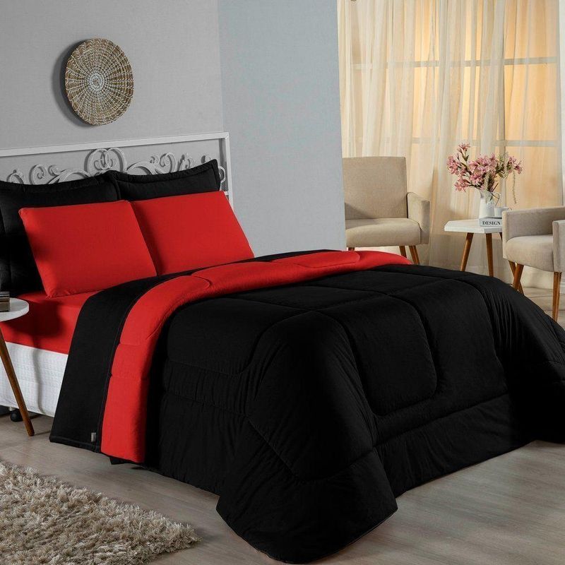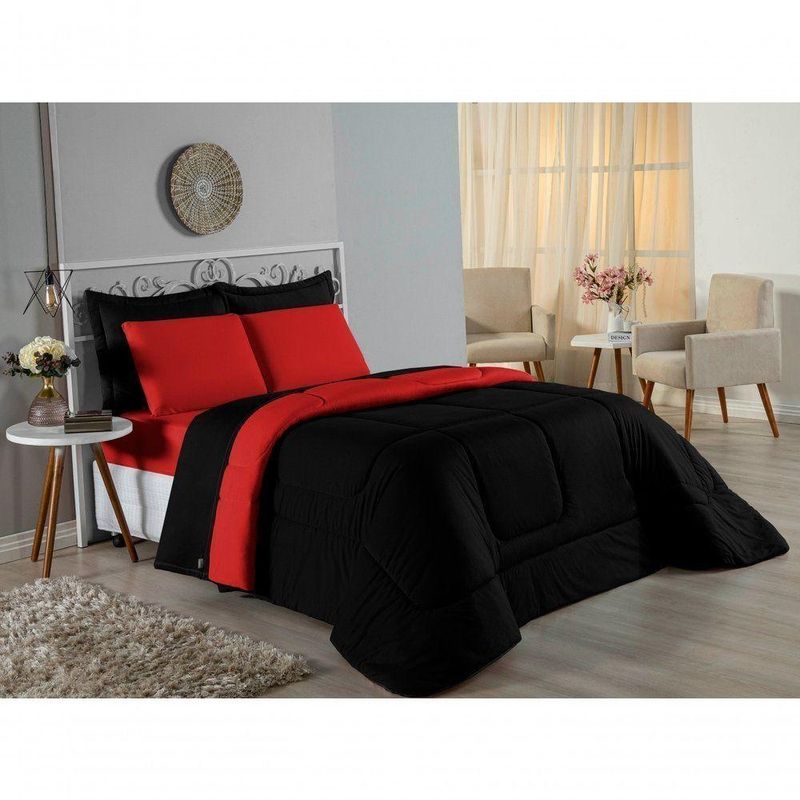 Kit Edredom Dupla Face + Jogo De Lençol Casal Viúva Nobre 6 Peças Malha 100% Algodão - Preto / VermelhoRenove o quarto das crianças ou de visitas com o Kit Cama Completa Casal Viúva Nobre 6 Peças. Uma solução prática e extremamente confortável que une o aquecimento do edredom, a elegância do porta travesseiro matelado e a suavidade do jogo de lençol em malha 100% algodão. Essa medida especial foi feita para as camas cama casal viúva ou solteiro viúva.Por que este Kit é uma ótima escolha?- Conforto da Malha Penteada: Todas as peças em contato com a pele são feitas em Malha 100% Algodão Fio 30/1 Penteado, garantindo toque macio, frescor e alta durabilidade sem formar bolinhas.- Cama Posta Coordenada: O kit já vem combinando! O edredom dupla face e o porta travesseiro decoram, enquanto o lençol e a fronha vestem o colchão com perfeição.- Praticidade do Elástico: O lençol de baixo possui elástico em toda a volta, facilitando a arrumação diária e garantindo que ele não escape do colchão.- Aconchego Térmico: O edredom com enchimento siliconado oferece o peso e o calor ideais para uma noite de sono tranquila.Produto composto por (Total 06 Peças):Do Kit Edredom (03 Peças):01 Edredom Casal Viúva Dupla Face: 2,00m x 2,20m02 Porta Travesseiro Matelado: 50cm x 70cmDo Jogo de Lençol (03 Peças):01 Lençol Casal Viúva com Elástico 1,28m x 1,98m x 30cm02 Fronha: 70cm x 50cmAtenção: Este kit é composto pelo jogo de cama essencial (lençol com elástico e fronha) e não inclui o lençol de cima (sobre lençol).Composição:Tecido (Todas as peças): Malha 100% Algodão - Fio 30/1 PenteadoEnchimento (Edredom e Porta Travesseiro): 100% Poliéster (Edredom com fibra siliconada)Forro (Apenas Porta Travesseiro): 100% Polipropileno
