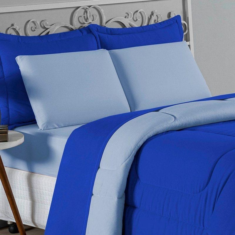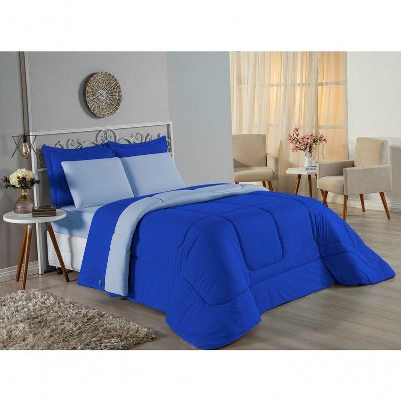 Kit Edredom Dupla Face + Jogo De Lençol Casal Viúva Nobre 6 Peças Malha 100% Algodão - Royal / Azul-bebêRenove o quarto das crianças ou de visitas com o Kit Cama Completa Casal Viúva Nobre 6 Peças. Uma solução prática e extremamente confortável que une o aquecimento do edredom, a elegância do porta travesseiro matelado e a suavidade do jogo de lençol em malha 100% algodão. Essa medida especial foi feita para as camas cama casal viúva ou solteiro viúva.Por que este Kit é uma ótima escolha?- Conforto da Malha Penteada: Todas as peças em contato com a pele são feitas em Malha 100% Algodão Fio 30/1 Penteado, garantindo toque macio, frescor e alta durabilidade sem formar bolinhas.- Cama Posta Coordenada: O kit já vem combinando! O edredom dupla face e o porta travesseiro decoram, enquanto o lençol e a fronha vestem o colchão com perfeição.- Praticidade do Elástico: O lençol de baixo possui elástico em toda a volta, facilitando a arrumação diária e garantindo que ele não escape do colchão.- Aconchego Térmico: O edredom com enchimento siliconado oferece o peso e o calor ideais para uma noite de sono tranquila.Produto composto por (Total 06 Peças):Do Kit Edredom (03 Peças):01 Edredom Casal Viúva Dupla Face: 2,00m x 2,20m02 Porta Travesseiro Matelado: 50cm x 70cmDo Jogo de Lençol (03 Peças):01 Lençol Casal Viúva com Elástico 1,28m x 1,98m x 30cm02 Fronha: 70cm x 50cmAtenção: Este kit é composto pelo jogo de cama essencial (lençol com elástico e fronha) e não inclui o lençol de cima (sobre lençol).Composição:Tecido (Todas as peças): Malha 100% Algodão - Fio 30/1 PenteadoEnchimento (Edredom e Porta Travesseiro): 100% Poliéster (Edredom com fibra siliconada)Forro (Apenas Porta Travesseiro): 100% Polipropileno