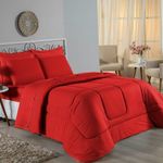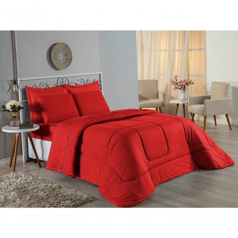 Kit Edredom Dupla Face + Jogo De Lençol Casal Viúva Nobre 6 Peças Malha 100% Algodão - VermelhoRenove o quarto das crianças ou de visitas com o Kit Cama Completa Casal Viúva Nobre 6 Peças. Uma solução prática e extremamente confortável que une o aquecimento do edredom, a elegância do porta travesseiro matelado e a suavidade do jogo de lençol em malha 100% algodão. Essa medida especial foi feita para as camas cama casal viúva ou solteiro viúva.Por que este Kit é uma ótima escolha?- Conforto da Malha Penteada: Todas as peças em contato com a pele são feitas em Malha 100% Algodão Fio 30/1 Penteado, garantindo toque macio, frescor e alta durabilidade sem formar bolinhas.- Cama Posta Coordenada: O kit já vem combinando! O edredom dupla face e o porta travesseiro decoram, enquanto o lençol e a fronha vestem o colchão com perfeição.- Praticidade do Elástico: O lençol de baixo possui elástico em toda a volta, facilitando a arrumação diária e garantindo que ele não escape do colchão.- Aconchego Térmico: O edredom com enchimento siliconado oferece o peso e o calor ideais para uma noite de sono tranquila.Produto composto por (Total 06 Peças):Do Kit Edredom (03 Peças):01 Edredom Casal Viúva Dupla Face: 2,00m x 2,20m02 Porta Travesseiro Matelado: 50cm x 70cmDo Jogo de Lençol (03 Peças):01 Lençol Casal Viúva com Elástico 1,28m x 1,98m x 30cm02 Fronha: 70cm x 50cmAtenção: Este kit é composto pelo jogo de cama essencial (lençol com elástico e fronha) e não inclui o lençol de cima (sobre lençol).Composição:Tecido (Todas as peças): Malha 100% Algodão - Fio 30/1 PenteadoEnchimento (Edredom e Porta Travesseiro): 100% Poliéster (Edredom com fibra siliconada)Forro (Apenas Porta Travesseiro): 100% Polipropileno
