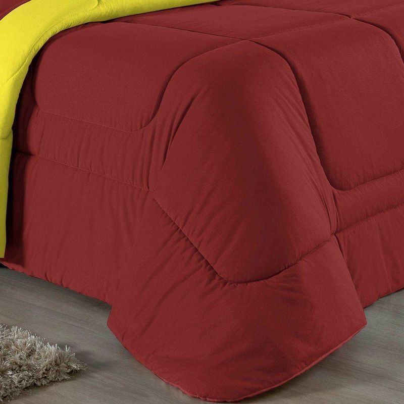 Kit Edredom Dupla Face + Jogo De Lençol Casal Viúva Nobre 6 Peças Malha 100% Algodão - Vinho / AmareloRenove o quarto das crianças ou de visitas com o Kit Cama Completa Casal Viúva Nobre 6 Peças. Uma solução prática e extremamente confortável que une o aquecimento do edredom, a elegância do porta travesseiro matelado e a suavidade do jogo de lençol em malha 100% algodão. Essa medida especial foi feita para as camas cama casal viúva ou solteiro viúva.Por que este Kit é uma ótima escolha?- Conforto da Malha Penteada: Todas as peças em contato com a pele são feitas em Malha 100% Algodão Fio 30/1 Penteado, garantindo toque macio, frescor e alta durabilidade sem formar bolinhas.- Cama Posta Coordenada: O kit já vem combinando! O edredom dupla face e o porta travesseiro decoram, enquanto o lençol e a fronha vestem o colchão com perfeição.- Praticidade do Elástico: O lençol de baixo possui elástico em toda a volta, facilitando a arrumação diária e garantindo que ele não escape do colchão.- Aconchego Térmico: O edredom com enchimento siliconado oferece o peso e o calor ideais para uma noite de sono tranquila.Produto composto por (Total 06 Peças):Do Kit Edredom (03 Peças):01 Edredom Casal Viúva Dupla Face: 2,00m x 2,20m02 Porta Travesseiro Matelado: 50cm x 70cmDo Jogo de Lençol (03 Peças):01 Lençol Casal Viúva com Elástico 1,28m x 1,98m x 30cm02 Fronha: 70cm x 50cmAtenção: Este kit é composto pelo jogo de cama essencial (lençol com elástico e fronha) e não inclui o lençol de cima (sobre lençol).Composição:Tecido (Todas as peças): Malha 100% Algodão - Fio 30/1 PenteadoEnchimento (Edredom e Porta Travesseiro): 100% Poliéster (Edredom com fibra siliconada)Forro (Apenas Porta Travesseiro): 100% Polipropileno