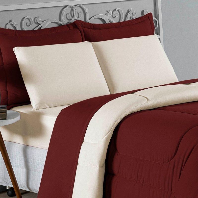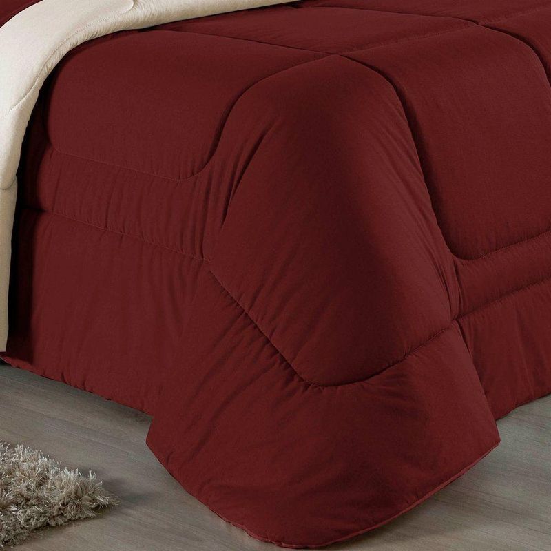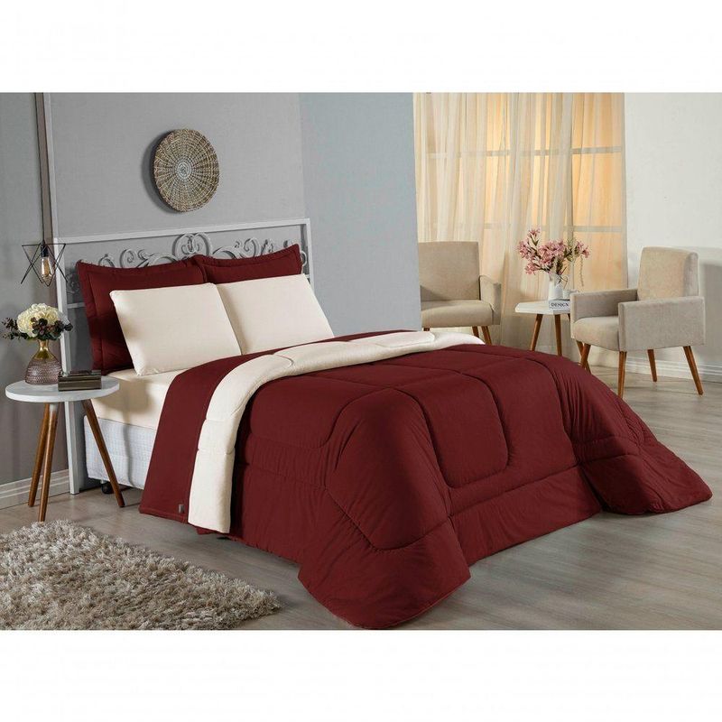 Kit Edredom Dupla Face + Jogo De Lençol Casal Viúva Nobre 6 Peças Malha 100% Algodão - Vinho / PalhaRenove o quarto das crianças ou de visitas com o Kit Cama Completa Casal Viúva Nobre 6 Peças. Uma solução prática e extremamente confortável que une o aquecimento do edredom, a elegância do porta travesseiro matelado e a suavidade do jogo de lençol em malha 100% algodão. Essa medida especial foi feita para as camas cama casal viúva ou solteiro viúva.Por que este Kit é uma ótima escolha?- Conforto da Malha Penteada: Todas as peças em contato com a pele são feitas em Malha 100% Algodão Fio 30/1 Penteado, garantindo toque macio, frescor e alta durabilidade sem formar bolinhas.- Cama Posta Coordenada: O kit já vem combinando! O edredom dupla face e o porta travesseiro decoram, enquanto o lençol e a fronha vestem o colchão com perfeição.- Praticidade do Elástico: O lençol de baixo possui elástico em toda a volta, facilitando a arrumação diária e garantindo que ele não escape do colchão.- Aconchego Térmico: O edredom com enchimento siliconado oferece o peso e o calor ideais para uma noite de sono tranquila.Produto composto por (Total 06 Peças):Do Kit Edredom (03 Peças):01 Edredom Casal Viúva Dupla Face: 2,00m x 2,20m02 Porta Travesseiro Matelado: 50cm x 70cmDo Jogo de Lençol (03 Peças):01 Lençol Casal Viúva com Elástico 1,28m x 1,98m x 30cm02 Fronha: 70cm x 50cmAtenção: Este kit é composto pelo jogo de cama essencial (lençol com elástico e fronha) e não inclui o lençol de cima (sobre lençol).Composição:Tecido (Todas as peças): Malha 100% Algodão - Fio 30/1 PenteadoEnchimento (Edredom e Porta Travesseiro): 100% Poliéster (Edredom com fibra siliconada)Forro (Apenas Porta Travesseiro): 100% Polipropileno
