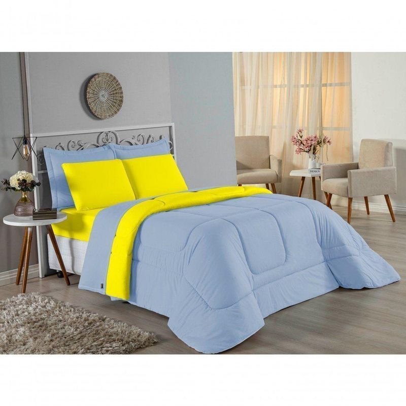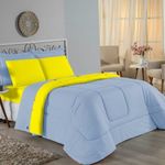 Kit Edredom Dupla Face + Jogo De Lençol Casal Viúva Nobre 7 Peças Malha 100% Algodão - Azul-bebê / AmareloGaranta a experiência completa de conforto e decoração com o Kit Cama Completa Casal Viúva Nobre 7 Peças. Este conjunto premium inclui todas as peças necessárias para vestir a cama, do lençol de cima ao edredom, tudo em malha 100% algodão. Essa medida especial foi feita para as camas cama casal viúva ou solteiro viúva.Por que este Kit é uma ótima escolha?- Enxoval Completo: Diferente dos kits básicos, este modelo inclui o Lençol de Cima, ideal para dias frescos e para proteger o edredom, garantindo higiene e conforto térmico.- Qualidade da Malha: Feito em 100% Algodão Fio 30/1 Penteado, oferece toque macio, não dá bolinhas e é altamente respirável.- Decoração Impecável: O edredom dupla face e o porta travesseiro matelado decoram a cama, enquanto o jogo de lençóis completo traz a sensação de cama de hotel.- Ajuste Seguro: O lençol de baixo com elástico fixa-se firmemente ao colchão Casal viúva.Produto composto por (Total 07 Peças):Do Kit Edredom (03 Peças):01 Edredom Casal Viúva Dupla Face: 2,00m x 2,20m02 Porta Travesseiro Matelado: 50cm x 70cmDo Jogo de Lençol (04 Peças):01 Lençol de Cima (Virol) Casal 2,40m x 2,20m01 Lençol Casal Viúva com Elástico 1,28m x 1,98m x 30cm02 Fronha: 70cm x 50cmComposição:Tecido (Todas as peças): Malha 100% Algodão - Fio 30/1 PenteadoEnchimento (Edredom e Porta Travesseiro): 100% Poliéster (Edredom com fibra siliconada)Forro (Apenas Porta Travesseiro): 100% Polipropileno