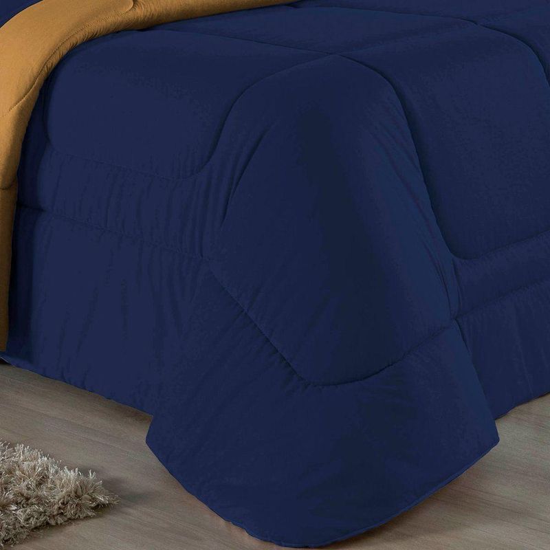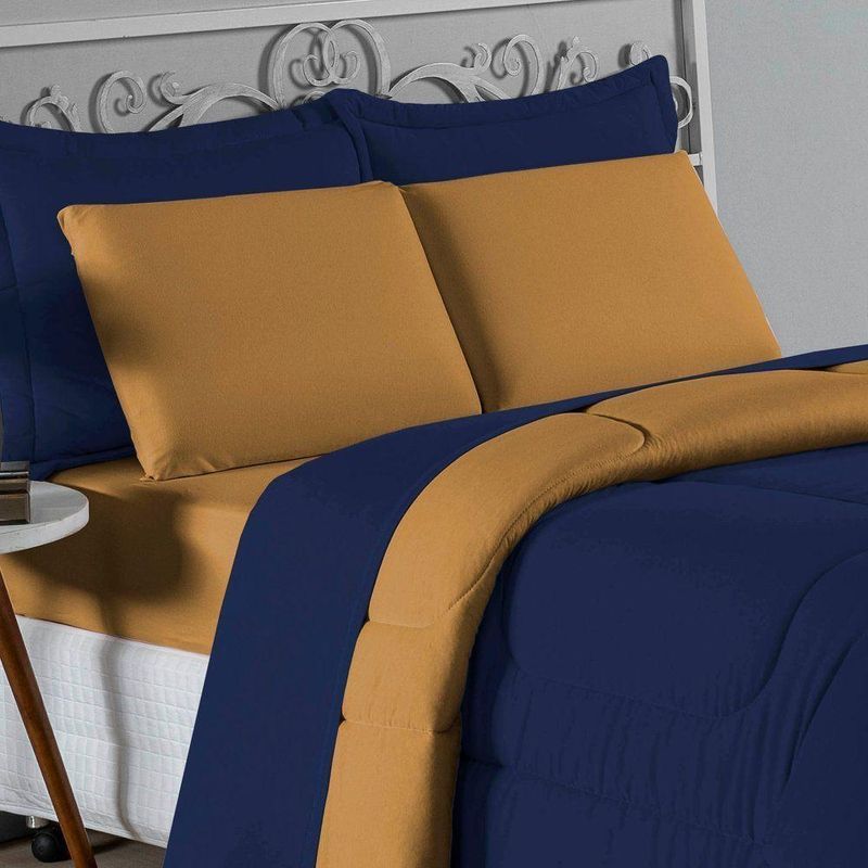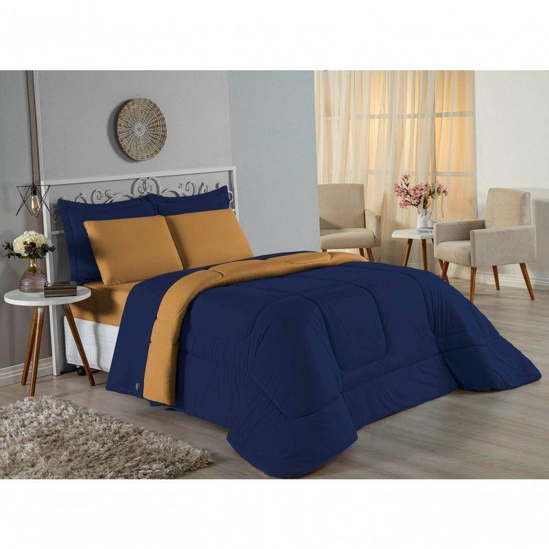 Kit Edredom Dupla Face + Jogo De Lençol Casal Viúva Nobre 7 Peças Malha 100% Algodão - Azul-marinho / CobreGaranta a experiência completa de conforto e decoração com o Kit Cama Completa Casal Viúva Nobre 7 Peças. Este conjunto premium inclui todas as peças necessárias para vestir a cama, do lençol de cima ao edredom, tudo em malha 100% algodão. Essa medida especial foi feita para as camas cama casal viúva ou solteiro viúva.Por que este Kit é uma ótima escolha?- Enxoval Completo: Diferente dos kits básicos, este modelo inclui o Lençol de Cima, ideal para dias frescos e para proteger o edredom, garantindo higiene e conforto térmico.- Qualidade da Malha: Feito em 100% Algodão Fio 30/1 Penteado, oferece toque macio, não dá bolinhas e é altamente respirável.- Decoração Impecável: O edredom dupla face e o porta travesseiro matelado decoram a cama, enquanto o jogo de lençóis completo traz a sensação de cama de hotel.- Ajuste Seguro: O lençol de baixo com elástico fixa-se firmemente ao colchão Casal viúva.Produto composto por (Total 07 Peças):Do Kit Edredom (03 Peças):01 Edredom Casal Viúva Dupla Face: 2,00m x 2,20m02 Porta Travesseiro Matelado: 50cm x 70cmDo Jogo de Lençol (04 Peças):01 Lençol de Cima (Virol) Casal 2,40m x 2,20m01 Lençol Casal Viúva com Elástico 1,28m x 1,98m x 30cm02 Fronha: 70cm x 50cmComposição:Tecido (Todas as peças): Malha 100% Algodão - Fio 30/1 PenteadoEnchimento (Edredom e Porta Travesseiro): 100% Poliéster (Edredom com fibra siliconada)Forro (Apenas Porta Travesseiro): 100% Polipropileno