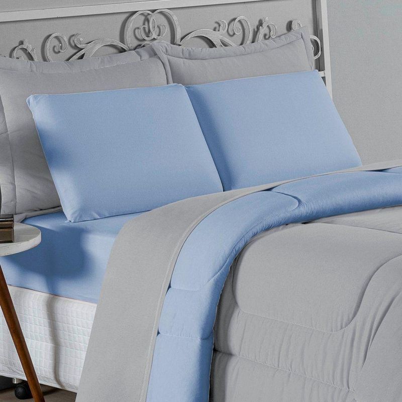 Kit Edredom Dupla Face + Jogo De Lençol Casal Viúva Nobre 7 Peças Malha 100% Algodão - Cinza / Azul-bebêGaranta a experiência completa de conforto e decoração com o Kit Cama Completa Casal Viúva Nobre 7 Peças. Este conjunto premium inclui todas as peças necessárias para vestir a cama, do lençol de cima ao edredom, tudo em malha 100% algodão. Essa medida especial foi feita para as camas cama casal viúva ou solteiro viúva.Por que este Kit é uma ótima escolha?- Enxoval Completo: Diferente dos kits básicos, este modelo inclui o Lençol de Cima, ideal para dias frescos e para proteger o edredom, garantindo higiene e conforto térmico.- Qualidade da Malha: Feito em 100% Algodão Fio 30/1 Penteado, oferece toque macio, não dá bolinhas e é altamente respirável.- Decoração Impecável: O edredom dupla face e o porta travesseiro matelado decoram a cama, enquanto o jogo de lençóis completo traz a sensação de cama de hotel.- Ajuste Seguro: O lençol de baixo com elástico fixa-se firmemente ao colchão Casal viúva.Produto composto por (Total 07 Peças):Do Kit Edredom (03 Peças):01 Edredom Casal Viúva Dupla Face: 2,00m x 2,20m02 Porta Travesseiro Matelado: 50cm x 70cmDo Jogo de Lençol (04 Peças):01 Lençol de Cima (Virol) Casal 2,40m x 2,20m01 Lençol Casal Viúva com Elástico 1,28m x 1,98m x 30cm02 Fronha: 70cm x 50cmComposição:Tecido (Todas as peças): Malha 100% Algodão - Fio 30/1 PenteadoEnchimento (Edredom e Porta Travesseiro): 100% Poliéster (Edredom com fibra siliconada)Forro (Apenas Porta Travesseiro): 100% Polipropileno