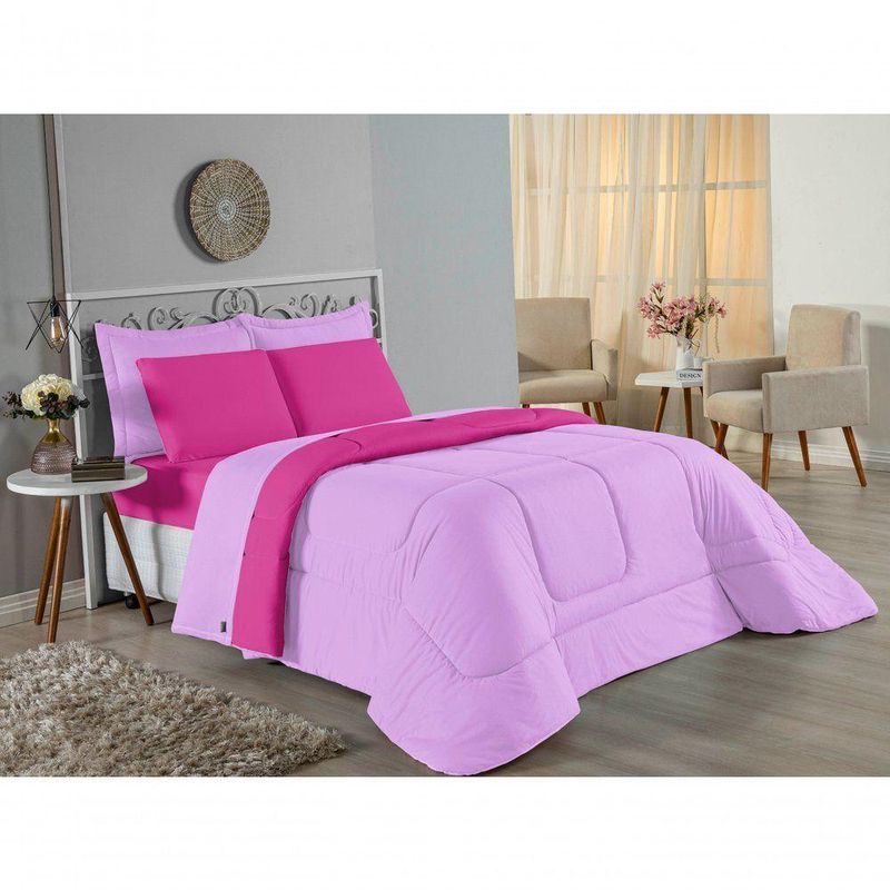 Kit Edredom Dupla Face + Jogo De Lençol Casal Viúva Nobre 7 Peças Malha 100% Algodão - Lilás / PinkGaranta a experiência completa de conforto e decoração com o Kit Cama Completa Casal Viúva Nobre 7 Peças. Este conjunto premium inclui todas as peças necessárias para vestir a cama, do lençol de cima ao edredom, tudo em malha 100% algodão. Essa medida especial foi feita para as camas cama casal viúva ou solteiro viúva.Por que este Kit é uma ótima escolha?- Enxoval Completo: Diferente dos kits básicos, este modelo inclui o Lençol de Cima, ideal para dias frescos e para proteger o edredom, garantindo higiene e conforto térmico.- Qualidade da Malha: Feito em 100% Algodão Fio 30/1 Penteado, oferece toque macio, não dá bolinhas e é altamente respirável.- Decoração Impecável: O edredom dupla face e o porta travesseiro matelado decoram a cama, enquanto o jogo de lençóis completo traz a sensação de cama de hotel.- Ajuste Seguro: O lençol de baixo com elástico fixa-se firmemente ao colchão Casal viúva.Produto composto por (Total 07 Peças):Do Kit Edredom (03 Peças):01 Edredom Casal Viúva Dupla Face: 2,00m x 2,20m02 Porta Travesseiro Matelado: 50cm x 70cmDo Jogo de Lençol (04 Peças):01 Lençol de Cima (Virol) Casal 2,40m x 2,20m01 Lençol Casal Viúva com Elástico 1,28m x 1,98m x 30cm02 Fronha: 70cm x 50cmComposição:Tecido (Todas as peças): Malha 100% Algodão - Fio 30/1 PenteadoEnchimento (Edredom e Porta Travesseiro): 100% Poliéster (Edredom com fibra siliconada)Forro (Apenas Porta Travesseiro): 100% Polipropileno