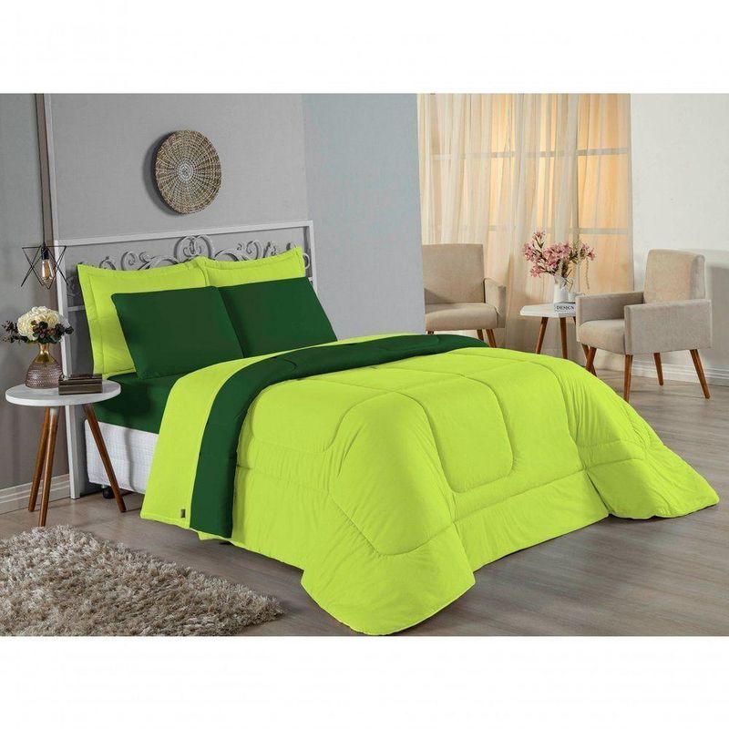 Kit Edredom Dupla Face + Jogo De Lençol Casal Viúva Nobre 7 Peças Malha 100% Algodão - Pistache / Verde-bandeiraGaranta a experiência completa de conforto e decoração com o Kit Cama Completa Casal Viúva Nobre 7 Peças. Este conjunto premium inclui todas as peças necessárias para vestir a cama, do lençol de cima ao edredom, tudo em malha 100% algodão. Essa medida especial foi feita para as camas cama casal viúva ou solteiro viúva.Por que este Kit é uma ótima escolha?- Enxoval Completo: Diferente dos kits básicos, este modelo inclui o Lençol de Cima, ideal para dias frescos e para proteger o edredom, garantindo higiene e conforto térmico.- Qualidade da Malha: Feito em 100% Algodão Fio 30/1 Penteado, oferece toque macio, não dá bolinhas e é altamente respirável.- Decoração Impecável: O edredom dupla face e o porta travesseiro matelado decoram a cama, enquanto o jogo de lençóis completo traz a sensação de cama de hotel.- Ajuste Seguro: O lençol de baixo com elástico fixa-se firmemente ao colchão Casal viúva.Produto composto por (Total 07 Peças):Do Kit Edredom (03 Peças):01 Edredom Casal Viúva Dupla Face: 2,00m x 2,20m02 Porta Travesseiro Matelado: 50cm x 70cmDo Jogo de Lençol (04 Peças):01 Lençol de Cima (Virol) Casal 2,40m x 2,20m01 Lençol Casal Viúva com Elástico 1,28m x 1,98m x 30cm02 Fronha: 70cm x 50cmComposição:Tecido (Todas as peças): Malha 100% Algodão - Fio 30/1 PenteadoEnchimento (Edredom e Porta Travesseiro): 100% Poliéster (Edredom com fibra siliconada)Forro (Apenas Porta Travesseiro): 100% Polipropileno