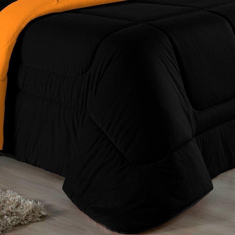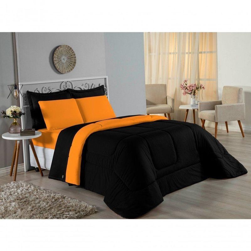 Kit Edredom Dupla Face + Jogo De Lençol Casal Viúva Nobre 7 Peças Malha 100% Algodão - Preto / LaranjaGaranta a experiência completa de conforto e decoração com o Kit Cama Completa Casal Viúva Nobre 7 Peças. Este conjunto premium inclui todas as peças necessárias para vestir a cama, do lençol de cima ao edredom, tudo em malha 100% algodão. Essa medida especial foi feita para as camas cama casal viúva ou solteiro viúva.Por que este Kit é uma ótima escolha?- Enxoval Completo: Diferente dos kits básicos, este modelo inclui o Lençol de Cima, ideal para dias frescos e para proteger o edredom, garantindo higiene e conforto térmico.- Qualidade da Malha: Feito em 100% Algodão Fio 30/1 Penteado, oferece toque macio, não dá bolinhas e é altamente respirável.- Decoração Impecável: O edredom dupla face e o porta travesseiro matelado decoram a cama, enquanto o jogo de lençóis completo traz a sensação de cama de hotel.- Ajuste Seguro: O lençol de baixo com elástico fixa-se firmemente ao colchão Casal viúva.Produto composto por (Total 07 Peças):Do Kit Edredom (03 Peças):01 Edredom Casal Viúva Dupla Face: 2,00m x 2,20m02 Porta Travesseiro Matelado: 50cm x 70cmDo Jogo de Lençol (04 Peças):01 Lençol de Cima (Virol) Casal 2,40m x 2,20m01 Lençol Casal Viúva com Elástico 1,28m x 1,98m x 30cm02 Fronha: 70cm x 50cmComposição:Tecido (Todas as peças): Malha 100% Algodão - Fio 30/1 PenteadoEnchimento (Edredom e Porta Travesseiro): 100% Poliéster (Edredom com fibra siliconada)Forro (Apenas Porta Travesseiro): 100% Polipropileno
