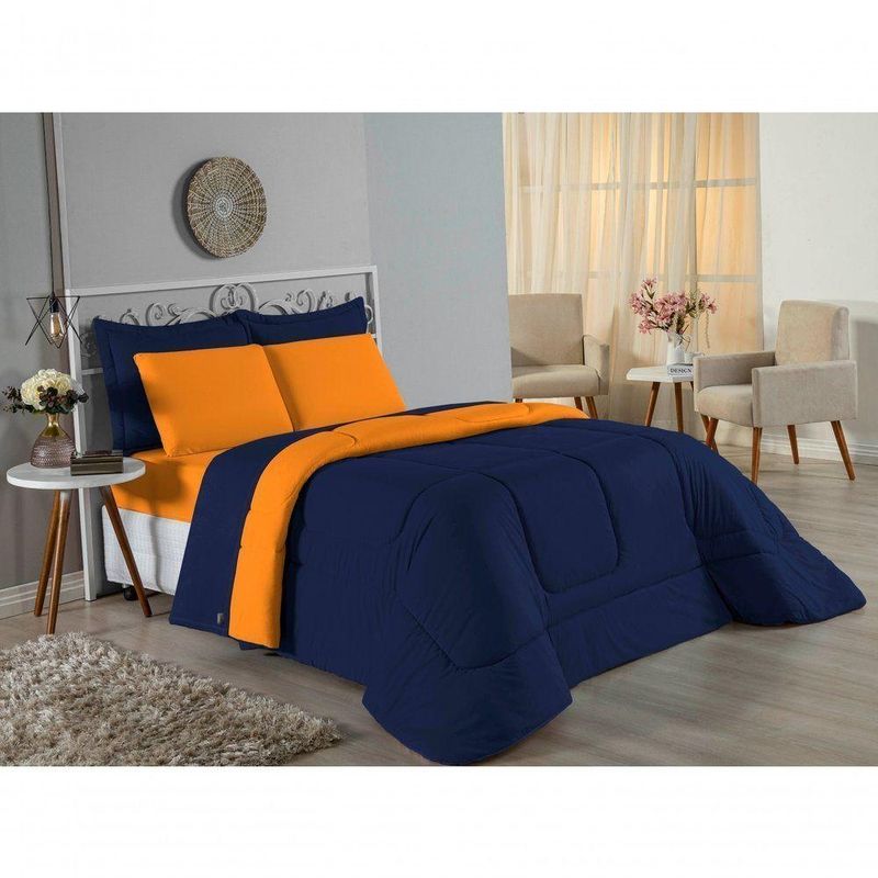Kit Edredom Dupla Face + Jogo De Lençol King Nobre 6 Peças Malha 100% Algodão - Azul-marinho / LaranjaExperimente a grandiosidade e o conforto supremo com o Kit Cama Completa King Nobre 6 Peças. Projetado para camas King Size, este conjunto une cobertura ampla, estilo moderno e a suavidade da malha pura.Por que este Kit é uma ótima escolha?- Maxi Conforto: O edredom King (2,50m x 2,90m) oferece cobertura total, enquanto o lençol de baixo se ajusta perfeitamente a colchões grandes.- Toque de Seda: Confeccionado inteiramente em Malha 100% Algodão Fio 30/1 Penteado, proporcionando uma experiência de sono luxuosa e respirável.- Estilo e Textura: A combinação do edredom liso com os porta travesseiros matelados adiciona sofisticação imediata ao quarto.- Resistência: O tratamento de fio penteado assegura que o tecido permaneça macio e sem bolinhas por muito mais tempo.Produto composto por (Total 06 Peças):Do Kit Edredom (03 Peças):01 Edredom King Dupla Face: 2,50m x 2,90m02 Porta Travesseiros Matelados: 50cm x 70cmDo Jogo de Lençol (03 Peças):01 Lençol de Baixo com Elástico: 1,93m x 2,03m x 30cm02 Fronhas: 50cm x 70cmAtenção: Este kit é composto pelo jogo de cama essencial (lençol com elástico e fronhas) e não inclui o lençol de cima (sobre lençol).Composição:Tecido (Todas as peças): Malha 100% Algodão - Fio 30/1 PenteadoEnchimento (Edredom e Porta Travesseiros): 100% Poliéster (Edredom com fibra siliconada)Forro (Apenas Porta Travesseiros): 100% Polipropileno