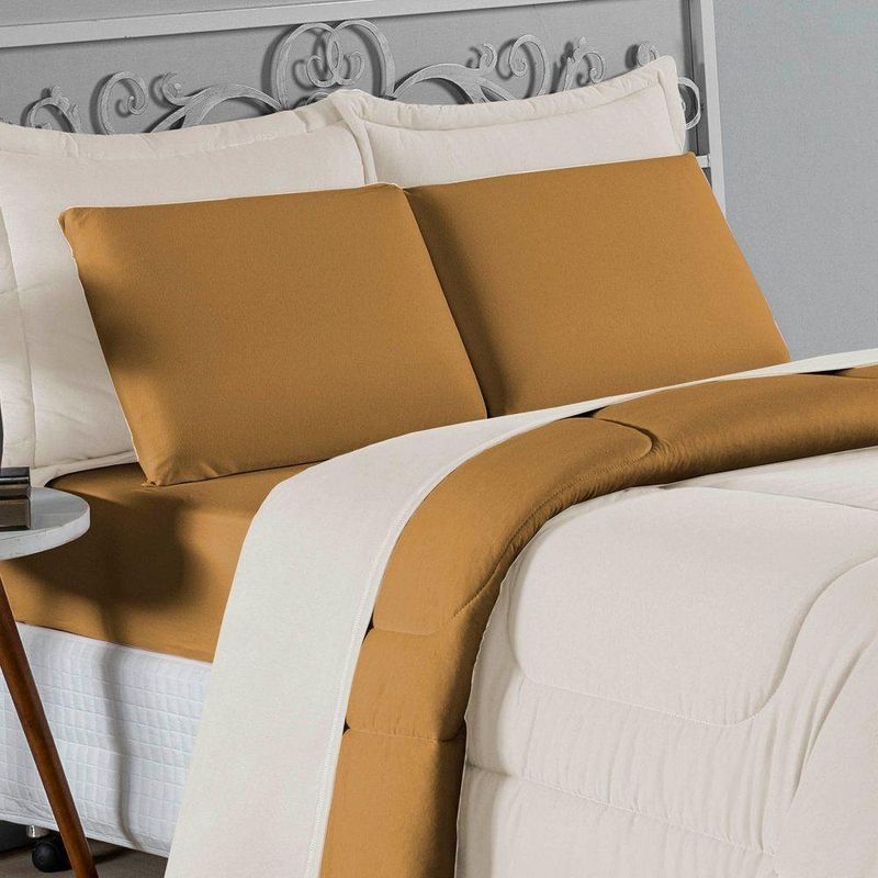 Kit Edredom Dupla Face + Jogo De Lençol King Nobre 6 Peças Malha 100% Algodão - Palha / CobreExperimente a grandiosidade e o conforto supremo com o Kit Cama Completa King Nobre 6 Peças. Projetado para camas King Size, este conjunto une cobertura ampla, estilo moderno e a suavidade da malha pura.Por que este Kit é uma ótima escolha?- Maxi Conforto: O edredom King (2,50m x 2,90m) oferece cobertura total, enquanto o lençol de baixo se ajusta perfeitamente a colchões grandes.- Toque de Seda: Confeccionado inteiramente em Malha 100% Algodão Fio 30/1 Penteado, proporcionando uma experiência de sono luxuosa e respirável.- Estilo e Textura: A combinação do edredom liso com os porta travesseiros matelados adiciona sofisticação imediata ao quarto.- Resistência: O tratamento de fio penteado assegura que o tecido permaneça macio e sem bolinhas por muito mais tempo.Produto composto por (Total 06 Peças):Do Kit Edredom (03 Peças):01 Edredom King Dupla Face: 2,50m x 2,90m02 Porta Travesseiros Matelados: 50cm x 70cmDo Jogo de Lençol (03 Peças):01 Lençol de Baixo com Elástico: 1,93m x 2,03m x 30cm02 Fronhas: 50cm x 70cmAtenção: Este kit é composto pelo jogo de cama essencial (lençol com elástico e fronhas) e não inclui o lençol de cima (sobre lençol).Composição:Tecido (Todas as peças): Malha 100% Algodão - Fio 30/1 PenteadoEnchimento (Edredom e Porta Travesseiros): 100% Poliéster (Edredom com fibra siliconada)Forro (Apenas Porta Travesseiros): 100% Polipropileno