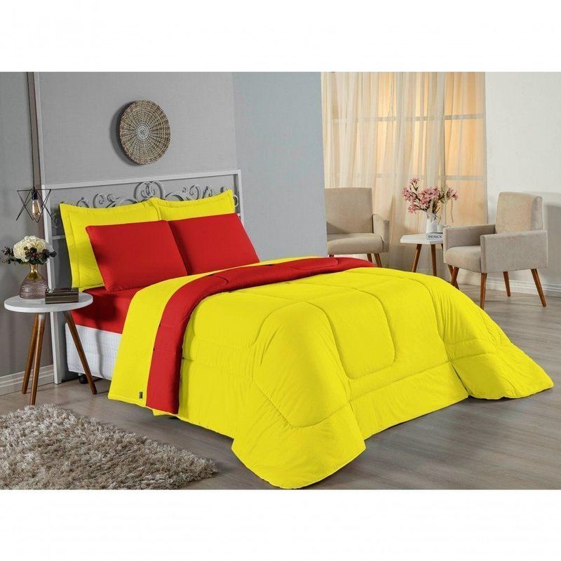 Kit Edredom Dupla Face + Jogo De Lençol King Nobre 7 Peças Malha 100% Algodão - Amarelo / VermelhoO máximo em luxo e conforto para o seu descanso: Kit Cama Completa King Nobre 7 Peças. Um enxoval majestoso que oferece cobertura total para camas King Size, com a qualidade superior da malha penteada.Por que este Kit é uma ótima escolha?- Cobertura Total King: O lençol de cima e o edredom possuem medidas generosas (até 2,90m de largura), garantindo caimento perfeito e noites sem guerra de coberta.- Malha 100% Algodão: O Fio 30/1 Penteado proporciona um toque de seda, excelente respirabilidade e resistência contra a formação de bolinhas.- Kit Tudo em Um: Solução completa com edredom quentinho, porta travesseiros decorativos e jogo de lençóis completo para higiene e conforto térmico.- Decoração Coordenada: Peças que conversam entre si, com texturas mateladas e acabamentos lisos para um visual clean e sofisticado.Produto composto por (Total 07 Peças):Do Kit Edredom (03 Peças):01 Edredom King Dupla Face: 2,50m x 2,90m02 Porta Travesseiros Matelados: 50cm x 70cmDo Jogo de Lençol (04 Peças):01 Lençol de Cima (Virol): 2,50m x 2,90m01 Lençol de Baixo com Elástico: 1,93m x 2,03m x 30cm02 Fronhas: 70cm x 50cmComposição:Tecido (Todas as peças): Malha 100% Algodão - Fio 30/1 PenteadoEnchimento (Edredom e Porta Travesseiros): 100% Poliéster (Edredom com fibra siliconada)Forro (Apenas Porta Travesseiros): 100% Polipropileno