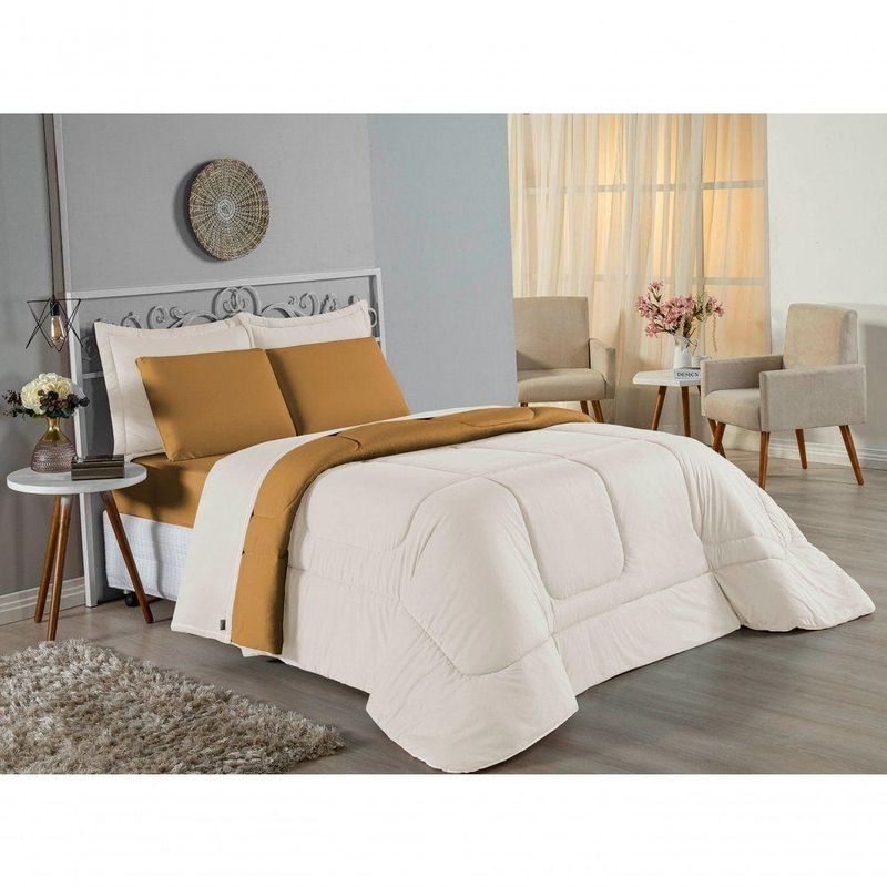 Kit Edredom Dupla Face + Jogo De Lençol King Nobre 7 Peças Malha 100% Algodão - Palha / CobreO máximo em luxo e conforto para o seu descanso: Kit Cama Completa King Nobre 7 Peças. Um enxoval majestoso que oferece cobertura total para camas King Size, com a qualidade superior da malha penteada.Por que este Kit é uma ótima escolha?- Cobertura Total King: O lençol de cima e o edredom possuem medidas generosas (até 2,90m de largura), garantindo caimento perfeito e noites sem guerra de coberta.- Malha 100% Algodão: O Fio 30/1 Penteado proporciona um toque de seda, excelente respirabilidade e resistência contra a formação de bolinhas.- Kit Tudo em Um: Solução completa com edredom quentinho, porta travesseiros decorativos e jogo de lençóis completo para higiene e conforto térmico.- Decoração Coordenada: Peças que conversam entre si, com texturas mateladas e acabamentos lisos para um visual clean e sofisticado.Produto composto por (Total 07 Peças):Do Kit Edredom (03 Peças):01 Edredom King Dupla Face: 2,50m x 2,90m02 Porta Travesseiros Matelados: 50cm x 70cmDo Jogo de Lençol (04 Peças):01 Lençol de Cima (Virol): 2,50m x 2,90m01 Lençol de Baixo com Elástico: 1,93m x 2,03m x 30cm02 Fronhas: 70cm x 50cmComposição:Tecido (Todas as peças): Malha 100% Algodão - Fio 30/1 PenteadoEnchimento (Edredom e Porta Travesseiros): 100% Poliéster (Edredom com fibra siliconada)Forro (Apenas Porta Travesseiros): 100% Polipropileno