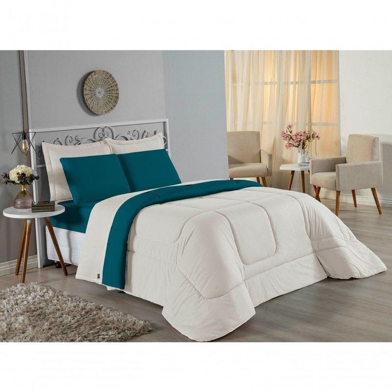 Kit Edredom Dupla Face + Jogo De Lençol King Nobre 7 Peças Malha 100% Algodão - Palha / PetróleoO máximo em luxo e conforto para o seu descanso: Kit Cama Completa King Nobre 7 Peças. Um enxoval majestoso que oferece cobertura total para camas King Size, com a qualidade superior da malha penteada.Por que este Kit é uma ótima escolha?- Cobertura Total King: O lençol de cima e o edredom possuem medidas generosas (até 2,90m de largura), garantindo caimento perfeito e noites sem guerra de coberta.- Malha 100% Algodão: O Fio 30/1 Penteado proporciona um toque de seda, excelente respirabilidade e resistência contra a formação de bolinhas.- Kit Tudo em Um: Solução completa com edredom quentinho, porta travesseiros decorativos e jogo de lençóis completo para higiene e conforto térmico.- Decoração Coordenada: Peças que conversam entre si, com texturas mateladas e acabamentos lisos para um visual clean e sofisticado.Produto composto por (Total 07 Peças):Do Kit Edredom (03 Peças):01 Edredom King Dupla Face: 2,50m x 2,90m02 Porta Travesseiros Matelados: 50cm x 70cmDo Jogo de Lençol (04 Peças):01 Lençol de Cima (Virol): 2,50m x 2,90m01 Lençol de Baixo com Elástico: 1,93m x 2,03m x 30cm02 Fronhas: 70cm x 50cmComposição:Tecido (Todas as peças): Malha 100% Algodão - Fio 30/1 PenteadoEnchimento (Edredom e Porta Travesseiros): 100% Poliéster (Edredom com fibra siliconada)Forro (Apenas Porta Travesseiros): 100% Polipropileno