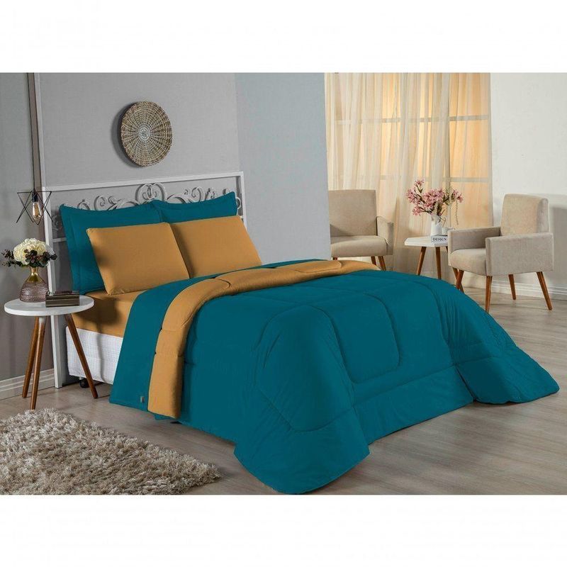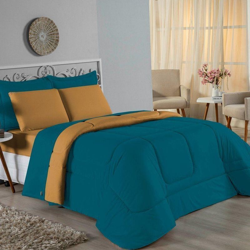 Kit Edredom Dupla Face + Jogo De Lençol King Nobre 7 Peças Malha 100% Algodão - Petróleo / CobreO máximo em luxo e conforto para o seu descanso: Kit Cama Completa King Nobre 7 Peças. Um enxoval majestoso que oferece cobertura total para camas King Size, com a qualidade superior da malha penteada.Por que este Kit é uma ótima escolha?- Cobertura Total King: O lençol de cima e o edredom possuem medidas generosas (até 2,90m de largura), garantindo caimento perfeito e noites sem guerra de coberta.- Malha 100% Algodão: O Fio 30/1 Penteado proporciona um toque de seda, excelente respirabilidade e resistência contra a formação de bolinhas.- Kit Tudo em Um: Solução completa com edredom quentinho, porta travesseiros decorativos e jogo de lençóis completo para higiene e conforto térmico.- Decoração Coordenada: Peças que conversam entre si, com texturas mateladas e acabamentos lisos para um visual clean e sofisticado.Produto composto por (Total 07 Peças):Do Kit Edredom (03 Peças):01 Edredom King Dupla Face: 2,50m x 2,90m02 Porta Travesseiros Matelados: 50cm x 70cmDo Jogo de Lençol (04 Peças):01 Lençol de Cima (Virol): 2,50m x 2,90m01 Lençol de Baixo com Elástico: 1,93m x 2,03m x 30cm02 Fronhas: 70cm x 50cmComposição:Tecido (Todas as peças): Malha 100% Algodão - Fio 30/1 PenteadoEnchimento (Edredom e Porta Travesseiros): 100% Poliéster (Edredom com fibra siliconada)Forro (Apenas Porta Travesseiros): 100% Polipropileno