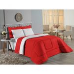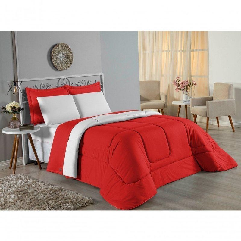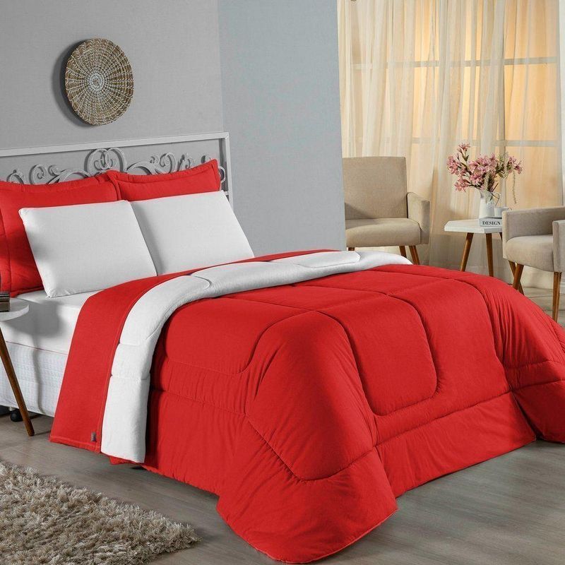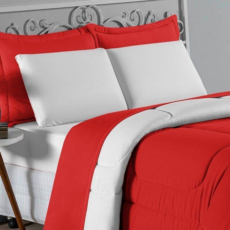 Kit Edredom Dupla Face + Jogo De Lençol King Nobre 7 Peças Malha 100% Algodão - Vermelho / BrancoO máximo em luxo e conforto para o seu descanso: Kit Cama Completa King Nobre 7 Peças. Um enxoval majestoso que oferece cobertura total para camas King Size, com a qualidade superior da malha penteada.Por que este Kit é uma ótima escolha?- Cobertura Total King: O lençol de cima e o edredom possuem medidas generosas (até 2,90m de largura), garantindo caimento perfeito e noites sem guerra de coberta.- Malha 100% Algodão: O Fio 30/1 Penteado proporciona um toque de seda, excelente respirabilidade e resistência contra a formação de bolinhas.- Kit Tudo em Um: Solução completa com edredom quentinho, porta travesseiros decorativos e jogo de lençóis completo para higiene e conforto térmico.- Decoração Coordenada: Peças que conversam entre si, com texturas mateladas e acabamentos lisos para um visual clean e sofisticado.Produto composto por (Total 07 Peças):Do Kit Edredom (03 Peças):01 Edredom King Dupla Face: 2,50m x 2,90m02 Porta Travesseiros Matelados: 50cm x 70cmDo Jogo de Lençol (04 Peças):01 Lençol de Cima (Virol): 2,50m x 2,90m01 Lençol de Baixo com Elástico: 1,93m x 2,03m x 30cm02 Fronhas: 70cm x 50cmComposição:Tecido (Todas as peças): Malha 100% Algodão - Fio 30/1 PenteadoEnchimento (Edredom e Porta Travesseiros): 100% Poliéster (Edredom com fibra siliconada)Forro (Apenas Porta Travesseiros): 100% Polipropileno
