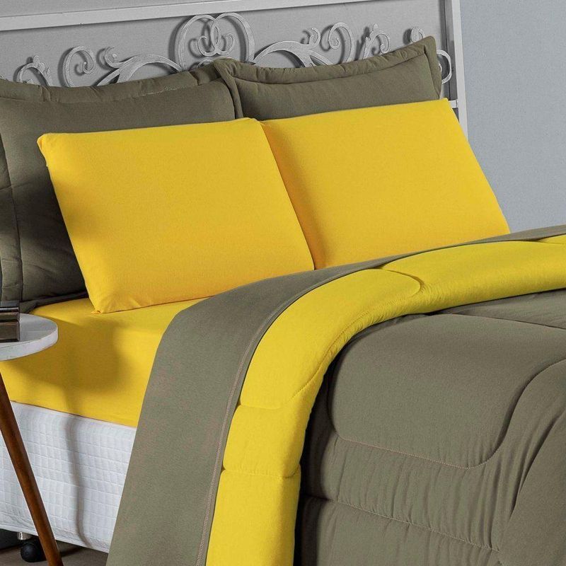 Kit Edredom Dupla Face + Jogo De Lençol Queen Nobre 6 Peças Malha 100% Algodão - Avelã / AmareloEleve o nível de conforto da sua cama Queen com o Kit Cama Completa Queen Nobre 6 Peças. Um conjunto coordenado que oferece a maciez incomparável da malha de algodão e a praticidade que sua rotina exige.Por que este Kit é uma ótima escolha?- Malha Nobre: Produzido em 100% Algodão Fio 30/1 Penteado, o kit é hipoalergênico, fresco e extremamente agradável ao toque.- Decoração Rica: Inclui edredom dupla face e porta travesseiros com acabamento matelado, criando uma cama posta volumosa e convidativa.- Praticidade Essencial: Focado nas peças que você mais usa, o kit traz o lençol com elástico firme para colchões Queen e fronhas macias para o rosto.- Qualidade Garantida: Tecido que não dá bolinha e enchimento de edredom que aquece na medida certa.Produto composto por (Total 06 Peças):Do Kit Edredom (03 Peças):01 Edredom Queen Dupla Face: 2,20m x 2,40m02 Porta Travesseiros Matelados: 50cm x 70cmDo Jogo de Lençol (03 Peças):01 Lençol de Baixo com Elástico: 1,58m x 1,98m x 30cm02 Fronhas: 70cm x 50cmAtenção: Este kit é composto pelo jogo de cama essencial (lençol com elástico e fronhas) e não inclui o lençol de cima (sobre lençol).Composição:Tecido (Todas as peças): Malha 100% Algodão - Fio 30/1 PenteadoEnchimento (Edredom e Porta Travesseiros): 100% Poliéster (Edredom com fibra siliconada)Forro (Apenas Porta Travesseiros): 100% Polipropileno