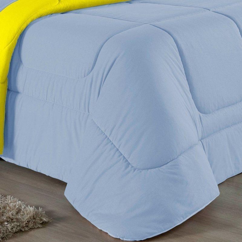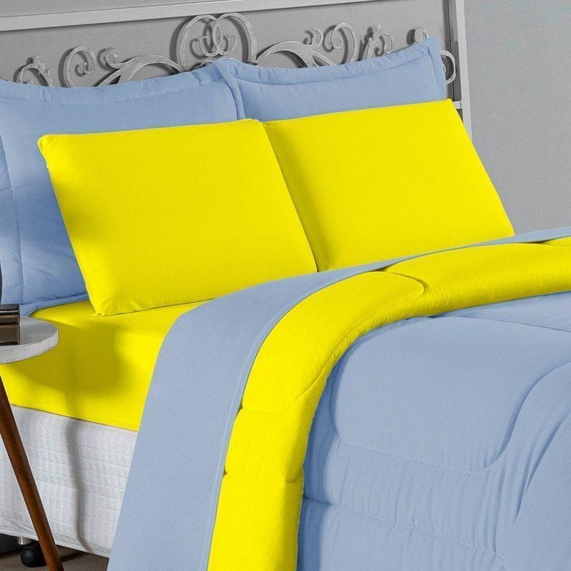 Kit Edredom Dupla Face + Jogo De Lençol Queen Nobre 6 Peças Malha 100% Algodão - Azul-bebê / AmareloEleve o nível de conforto da sua cama Queen com o Kit Cama Completa Queen Nobre 6 Peças. Um conjunto coordenado que oferece a maciez incomparável da malha de algodão e a praticidade que sua rotina exige.Por que este Kit é uma ótima escolha?- Malha Nobre: Produzido em 100% Algodão Fio 30/1 Penteado, o kit é hipoalergênico, fresco e extremamente agradável ao toque.- Decoração Rica: Inclui edredom dupla face e porta travesseiros com acabamento matelado, criando uma cama posta volumosa e convidativa.- Praticidade Essencial: Focado nas peças que você mais usa, o kit traz o lençol com elástico firme para colchões Queen e fronhas macias para o rosto.- Qualidade Garantida: Tecido que não dá bolinha e enchimento de edredom que aquece na medida certa.Produto composto por (Total 06 Peças):Do Kit Edredom (03 Peças):01 Edredom Queen Dupla Face: 2,20m x 2,40m02 Porta Travesseiros Matelados: 50cm x 70cmDo Jogo de Lençol (03 Peças):01 Lençol de Baixo com Elástico: 1,58m x 1,98m x 30cm02 Fronhas: 70cm x 50cmAtenção: Este kit é composto pelo jogo de cama essencial (lençol com elástico e fronhas) e não inclui o lençol de cima (sobre lençol).Composição:Tecido (Todas as peças): Malha 100% Algodão - Fio 30/1 PenteadoEnchimento (Edredom e Porta Travesseiros): 100% Poliéster (Edredom com fibra siliconada)Forro (Apenas Porta Travesseiros): 100% Polipropileno