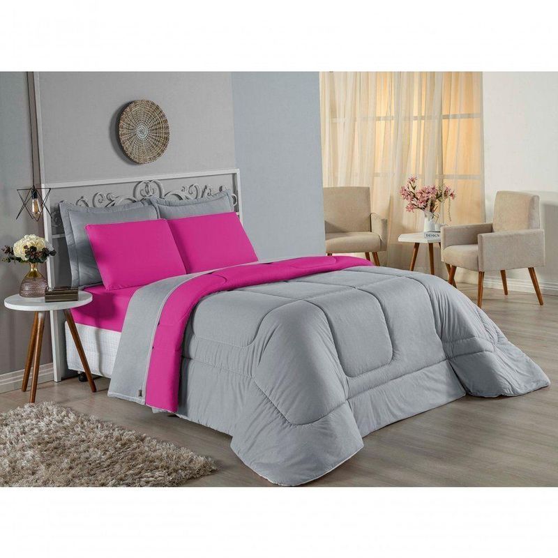 Kit Edredom Dupla Face + Jogo De Lençol Queen Nobre 6 Peças Malha 100% Algodão - Cinza / PinkEleve o nível de conforto da sua cama Queen com o Kit Cama Completa Queen Nobre 6 Peças. Um conjunto coordenado que oferece a maciez incomparável da malha de algodão e a praticidade que sua rotina exige.Por que este Kit é uma ótima escolha?- Malha Nobre: Produzido em 100% Algodão Fio 30/1 Penteado, o kit é hipoalergênico, fresco e extremamente agradável ao toque.- Decoração Rica: Inclui edredom dupla face e porta travesseiros com acabamento matelado, criando uma cama posta volumosa e convidativa.- Praticidade Essencial: Focado nas peças que você mais usa, o kit traz o lençol com elástico firme para colchões Queen e fronhas macias para o rosto.- Qualidade Garantida: Tecido que não dá bolinha e enchimento de edredom que aquece na medida certa.Produto composto por (Total 06 Peças):Do Kit Edredom (03 Peças):01 Edredom Queen Dupla Face: 2,20m x 2,40m02 Porta Travesseiros Matelados: 50cm x 70cmDo Jogo de Lençol (03 Peças):01 Lençol de Baixo com Elástico: 1,58m x 1,98m x 30cm02 Fronhas: 70cm x 50cmAtenção: Este kit é composto pelo jogo de cama essencial (lençol com elástico e fronhas) e não inclui o lençol de cima (sobre lençol).Composição:Tecido (Todas as peças): Malha 100% Algodão - Fio 30/1 PenteadoEnchimento (Edredom e Porta Travesseiros): 100% Poliéster (Edredom com fibra siliconada)Forro (Apenas Porta Travesseiros): 100% Polipropileno