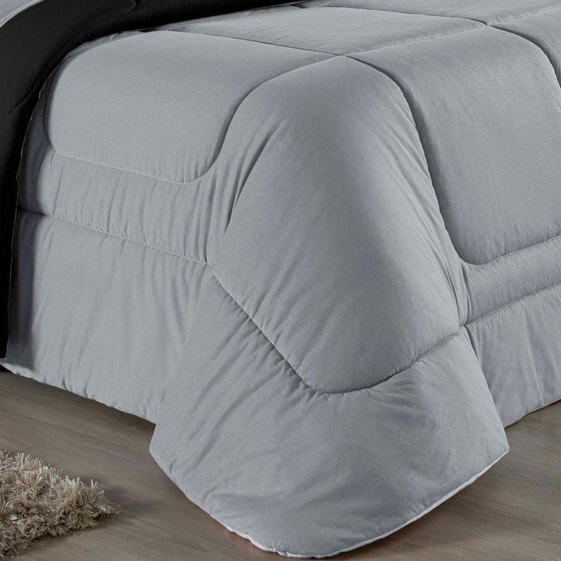 Kit Edredom Dupla Face + Jogo De Lençol Queen Nobre 6 Peças Malha 100% Algodão - Cinza / PretoEleve o nível de conforto da sua cama Queen com o Kit Cama Completa Queen Nobre 6 Peças. Um conjunto coordenado que oferece a maciez incomparável da malha de algodão e a praticidade que sua rotina exige.Por que este Kit é uma ótima escolha?- Malha Nobre: Produzido em 100% Algodão Fio 30/1 Penteado, o kit é hipoalergênico, fresco e extremamente agradável ao toque.- Decoração Rica: Inclui edredom dupla face e porta travesseiros com acabamento matelado, criando uma cama posta volumosa e convidativa.- Praticidade Essencial: Focado nas peças que você mais usa, o kit traz o lençol com elástico firme para colchões Queen e fronhas macias para o rosto.- Qualidade Garantida: Tecido que não dá bolinha e enchimento de edredom que aquece na medida certa.Produto composto por (Total 06 Peças):Do Kit Edredom (03 Peças):01 Edredom Queen Dupla Face: 2,20m x 2,40m02 Porta Travesseiros Matelados: 50cm x 70cmDo Jogo de Lençol (03 Peças):01 Lençol de Baixo com Elástico: 1,58m x 1,98m x 30cm02 Fronhas: 70cm x 50cmAtenção: Este kit é composto pelo jogo de cama essencial (lençol com elástico e fronhas) e não inclui o lençol de cima (sobre lençol).Composição:Tecido (Todas as peças): Malha 100% Algodão - Fio 30/1 PenteadoEnchimento (Edredom e Porta Travesseiros): 100% Poliéster (Edredom com fibra siliconada)Forro (Apenas Porta Travesseiros): 100% Polipropileno