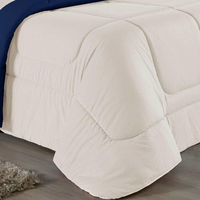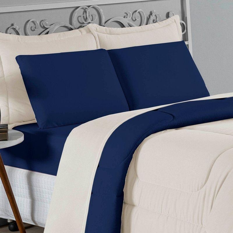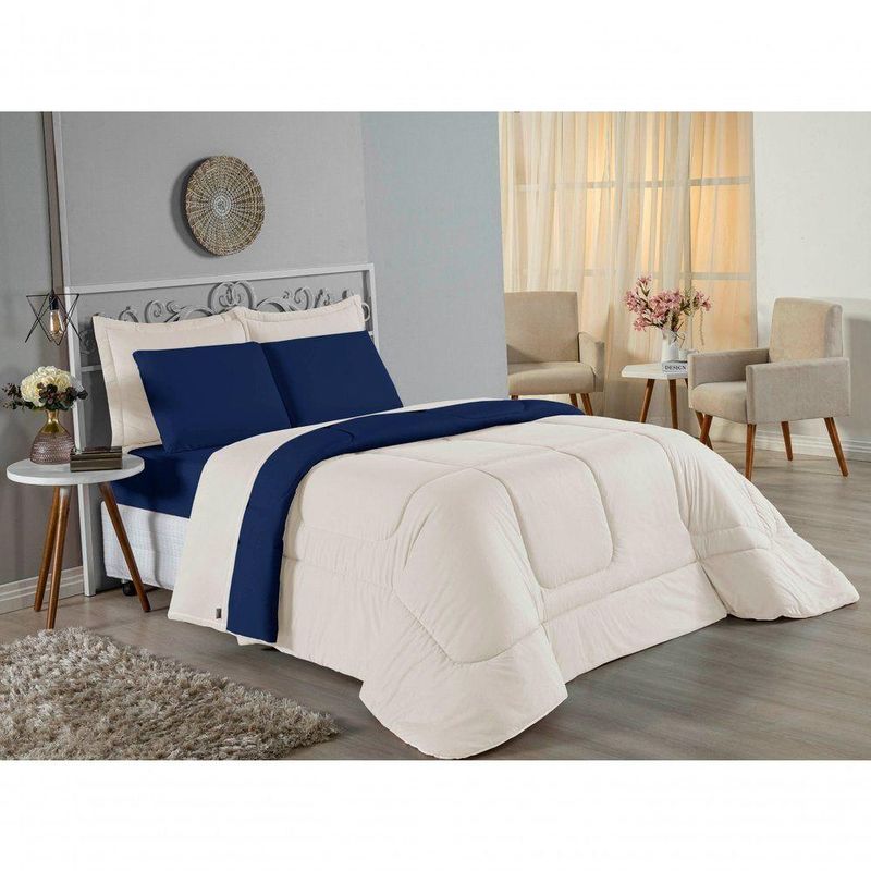 Kit Edredom Dupla Face + Jogo De Lençol Queen Nobre 6 Peças Malha 100% Algodão - Palha / Azul-marinhoEleve o nível de conforto da sua cama Queen com o Kit Cama Completa Queen Nobre 6 Peças. Um conjunto coordenado que oferece a maciez incomparável da malha de algodão e a praticidade que sua rotina exige.Por que este Kit é uma ótima escolha?- Malha Nobre: Produzido em 100% Algodão Fio 30/1 Penteado, o kit é hipoalergênico, fresco e extremamente agradável ao toque.- Decoração Rica: Inclui edredom dupla face e porta travesseiros com acabamento matelado, criando uma cama posta volumosa e convidativa.- Praticidade Essencial: Focado nas peças que você mais usa, o kit traz o lençol com elástico firme para colchões Queen e fronhas macias para o rosto.- Qualidade Garantida: Tecido que não dá bolinha e enchimento de edredom que aquece na medida certa.Produto composto por (Total 06 Peças):Do Kit Edredom (03 Peças):01 Edredom Queen Dupla Face: 2,20m x 2,40m02 Porta Travesseiros Matelados: 50cm x 70cmDo Jogo de Lençol (03 Peças):01 Lençol de Baixo com Elástico: 1,58m x 1,98m x 30cm02 Fronhas: 70cm x 50cmAtenção: Este kit é composto pelo jogo de cama essencial (lençol com elástico e fronhas) e não inclui o lençol de cima (sobre lençol).Composição:Tecido (Todas as peças): Malha 100% Algodão - Fio 30/1 PenteadoEnchimento (Edredom e Porta Travesseiros): 100% Poliéster (Edredom com fibra siliconada)Forro (Apenas Porta Travesseiros): 100% Polipropileno