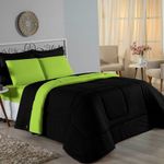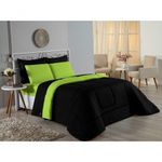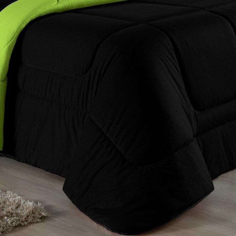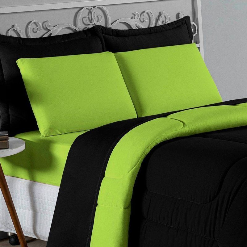 Kit Edredom Dupla Face + Jogo De Lençol Queen Nobre 6 Peças Malha 100% Algodão - Preto / PistacheEleve o nível de conforto da sua cama Queen com o Kit Cama Completa Queen Nobre 6 Peças. Um conjunto coordenado que oferece a maciez incomparável da malha de algodão e a praticidade que sua rotina exige.Por que este Kit é uma ótima escolha?- Malha Nobre: Produzido em 100% Algodão Fio 30/1 Penteado, o kit é hipoalergênico, fresco e extremamente agradável ao toque.- Decoração Rica: Inclui edredom dupla face e porta travesseiros com acabamento matelado, criando uma cama posta volumosa e convidativa.- Praticidade Essencial: Focado nas peças que você mais usa, o kit traz o lençol com elástico firme para colchões Queen e fronhas macias para o rosto.- Qualidade Garantida: Tecido que não dá bolinha e enchimento de edredom que aquece na medida certa.Produto composto por (Total 06 Peças):Do Kit Edredom (03 Peças):01 Edredom Queen Dupla Face: 2,20m x 2,40m02 Porta Travesseiros Matelados: 50cm x 70cmDo Jogo de Lençol (03 Peças):01 Lençol de Baixo com Elástico: 1,58m x 1,98m x 30cm02 Fronhas: 70cm x 50cmAtenção: Este kit é composto pelo jogo de cama essencial (lençol com elástico e fronhas) e não inclui o lençol de cima (sobre lençol).Composição:Tecido (Todas as peças): Malha 100% Algodão - Fio 30/1 PenteadoEnchimento (Edredom e Porta Travesseiros): 100% Poliéster (Edredom com fibra siliconada)Forro (Apenas Porta Travesseiros): 100% Polipropileno