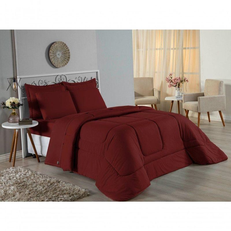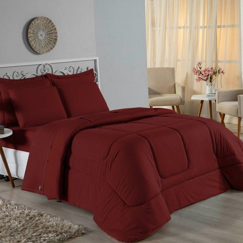 Kit Edredom Dupla Face + Jogo De Lençol Queen Nobre 6 Peças Malha 100% Algodão - VinhoEleve o nível de conforto da sua cama Queen com o Kit Cama Completa Queen Nobre 6 Peças. Um conjunto coordenado que oferece a maciez incomparável da malha de algodão e a praticidade que sua rotina exige.Por que este Kit é uma ótima escolha?- Malha Nobre: Produzido em 100% Algodão Fio 30/1 Penteado, o kit é hipoalergênico, fresco e extremamente agradável ao toque.- Decoração Rica: Inclui edredom dupla face e porta travesseiros com acabamento matelado, criando uma cama posta volumosa e convidativa.- Praticidade Essencial: Focado nas peças que você mais usa, o kit traz o lençol com elástico firme para colchões Queen e fronhas macias para o rosto.- Qualidade Garantida: Tecido que não dá bolinha e enchimento de edredom que aquece na medida certa.Produto composto por (Total 06 Peças):Do Kit Edredom (03 Peças):01 Edredom Queen Dupla Face: 2,20m x 2,40m02 Porta Travesseiros Matelados: 50cm x 70cmDo Jogo de Lençol (03 Peças):01 Lençol de Baixo com Elástico: 1,58m x 1,98m x 30cm02 Fronhas: 70cm x 50cmAtenção: Este kit é composto pelo jogo de cama essencial (lençol com elástico e fronhas) e não inclui o lençol de cima (sobre lençol).Composição:Tecido (Todas as peças): Malha 100% Algodão - Fio 30/1 PenteadoEnchimento (Edredom e Porta Travesseiros): 100% Poliéster (Edredom com fibra siliconada)Forro (Apenas Porta Travesseiros): 100% Polipropileno