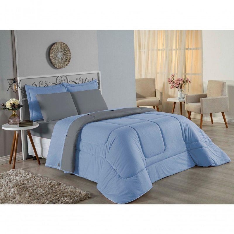Kit Edredom Dupla Face + Jogo De Lençol Queen Nobre 7 Peças Malha 100% Algodão - Azul-bebê / CinzaTransforme seu quarto em uma suíte master com o Kit Cama Completa Queen Nobre 7 Peças. Sofisticação, qualidade e conforto se unem neste conjunto que veste sua cama Queen por completo, do lençol ao edredom.Por que este Kit é uma ótima escolha?- Experiência de Hotel: Com 7 peças, incluindo lençol de cima amplo e edredom volumoso, sua cama ficará sempre convidativa e elegante.- Toque Suave e Natural: Produzido em Malha 100% Algodão Fio 30/1 Penteado, o tecido é fresco, macio e extremamente durável.- Detalhes que Importam: Porta travesseiros matelados para decoração e fronhas macias para dormir, garantindo beleza e funcionalidade.- Caimento Perfeito: Lençóis desenvolvidos para colchões Queen, garantindo ajuste firme e cobertura ideal.Produto composto por (Total 07 Peças):Do Kit Edredom (03 Peças):01 Edredom Queen Dupla Face: 2,20m x 2,40m02 Porta Travesseiros Matelados: 50cm x 70cmDo Jogo de Lençol (04 Peças):01 Lençol de Cima (Virol): 2,40m x 2,60m01 Lençol de Baixo com Elástico: 1,58m x 1,98m x 30cm02 Fronhas: 70cm x 50cmComposição:Tecido (Todas as peças): Malha 100% Algodão - Fio 30/1 PenteadoEnchimento (Edredom e Porta Travesseiros): 100% Poliéster (Edredom com fibra siliconada)Forro (Apenas Porta Travesseiros): 100% Polipropileno