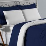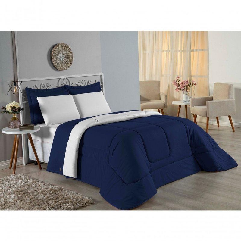 Kit Edredom Dupla Face + Jogo De Lençol Queen Nobre 7 Peças Malha 100% Algodão - Azul-marinho / BrancoTransforme seu quarto em uma suíte master com o Kit Cama Completa Queen Nobre 7 Peças. Sofisticação, qualidade e conforto se unem neste conjunto que veste sua cama Queen por completo, do lençol ao edredom.Por que este Kit é uma ótima escolha?- Experiência de Hotel: Com 7 peças, incluindo lençol de cima amplo e edredom volumoso, sua cama ficará sempre convidativa e elegante.- Toque Suave e Natural: Produzido em Malha 100% Algodão Fio 30/1 Penteado, o tecido é fresco, macio e extremamente durável.- Detalhes que Importam: Porta travesseiros matelados para decoração e fronhas macias para dormir, garantindo beleza e funcionalidade.- Caimento Perfeito: Lençóis desenvolvidos para colchões Queen, garantindo ajuste firme e cobertura ideal.Produto composto por (Total 07 Peças):Do Kit Edredom (03 Peças):01 Edredom Queen Dupla Face: 2,20m x 2,40m02 Porta Travesseiros Matelados: 50cm x 70cmDo Jogo de Lençol (04 Peças):01 Lençol de Cima (Virol): 2,40m x 2,60m01 Lençol de Baixo com Elástico: 1,58m x 1,98m x 30cm02 Fronhas: 70cm x 50cmComposição:Tecido (Todas as peças): Malha 100% Algodão - Fio 30/1 PenteadoEnchimento (Edredom e Porta Travesseiros): 100% Poliéster (Edredom com fibra siliconada)Forro (Apenas Porta Travesseiros): 100% Polipropileno