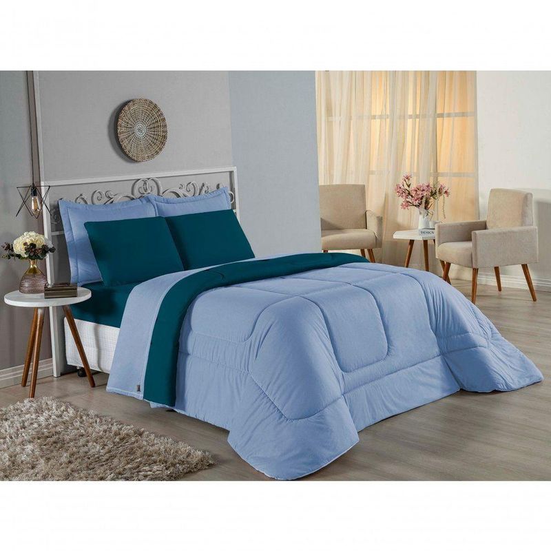 Kit Edredom Dupla Face + Jogo De Lençol Solteiro Nobre 4 Peças Malha 100% Algodão - Azul-bebê / PetróleoRenove o quarto das crianças ou de visitas com o Kit Cama Completa Solteiro Nobre 4 Peças. Uma solução prática e extremamente confortável que une o aquecimento do edredom, a elegância do porta travesseiro matelado e a suavidade do jogo de lençol em malha 100% algodão.Por que este Kit é uma ótima escolha?- Conforto da Malha Penteada: Todas as peças em contato com a pele são feitas em Malha 100% Algodão Fio 30/1 Penteado, garantindo toque macio, frescor e alta durabilidade sem formar bolinhas.- Cama Posta Coordenada: O kit já vem combinando! O edredom dupla face e o porta travesseiro decoram, enquanto o lençol e a fronha vestem o colchão com perfeição.- Praticidade do Elástico: O lençol de baixo possui elástico em toda a volta, facilitando a arrumação diária e garantindo que ele não escape do colchão.- Aconchego Térmico: O edredom com enchimento siliconado oferece o peso e o calor ideais para uma noite de sono tranquila.Produto composto por (Total 04 Peças):Do Kit Edredom (02 Peças):01 Edredom Solteiro Dupla Face: 1,60m x 2,40m01 Porta Travesseiro Matelado: 50cm x 70cmDo Jogo de Lençol (02 Peças):01 Lençol de Baixo com Elástico: 1,88m x 88cm x 30cm01 Fronha: 70cm x 50cmAtenção: Este kit é composto pelo jogo de cama essencial (lençol com elástico e fronha) e não inclui o lençol de cima (sobre lençol).Composição:Tecido (Todas as peças): Malha 100% Algodão - Fio 30/1 PenteadoEnchimento (Edredom e Porta Travesseiro): 100% Poliéster (Edredom com fibra siliconada)Forro (Apenas Porta Travesseiro): 100% Polipropileno