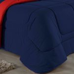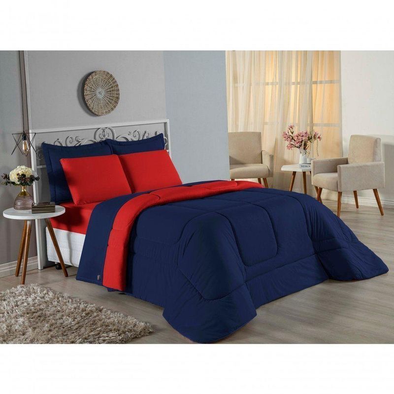 Kit Edredom Dupla Face + Jogo De Lençol Solteiro Nobre 4 Peças Malha 100% Algodão - Azul-marinho / VermelhoRenove o quarto das crianças ou de visitas com o Kit Cama Completa Solteiro Nobre 4 Peças. Uma solução prática e extremamente confortável que une o aquecimento do edredom, a elegância do porta travesseiro matelado e a suavidade do jogo de lençol em malha 100% algodão.Por que este Kit é uma ótima escolha?- Conforto da Malha Penteada: Todas as peças em contato com a pele são feitas em Malha 100% Algodão Fio 30/1 Penteado, garantindo toque macio, frescor e alta durabilidade sem formar bolinhas.- Cama Posta Coordenada: O kit já vem combinando! O edredom dupla face e o porta travesseiro decoram, enquanto o lençol e a fronha vestem o colchão com perfeição.- Praticidade do Elástico: O lençol de baixo possui elástico em toda a volta, facilitando a arrumação diária e garantindo que ele não escape do colchão.- Aconchego Térmico: O edredom com enchimento siliconado oferece o peso e o calor ideais para uma noite de sono tranquila.Produto composto por (Total 04 Peças):Do Kit Edredom (02 Peças):01 Edredom Solteiro Dupla Face: 1,60m x 2,40m01 Porta Travesseiro Matelado: 50cm x 70cmDo Jogo de Lençol (02 Peças):01 Lençol de Baixo com Elástico: 1,88m x 88cm x 30cm01 Fronha: 70cm x 50cmAtenção: Este kit é composto pelo jogo de cama essencial (lençol com elástico e fronha) e não inclui o lençol de cima (sobre lençol).Composição:Tecido (Todas as peças): Malha 100% Algodão - Fio 30/1 PenteadoEnchimento (Edredom e Porta Travesseiro): 100% Poliéster (Edredom com fibra siliconada)Forro (Apenas Porta Travesseiro): 100% Polipropileno