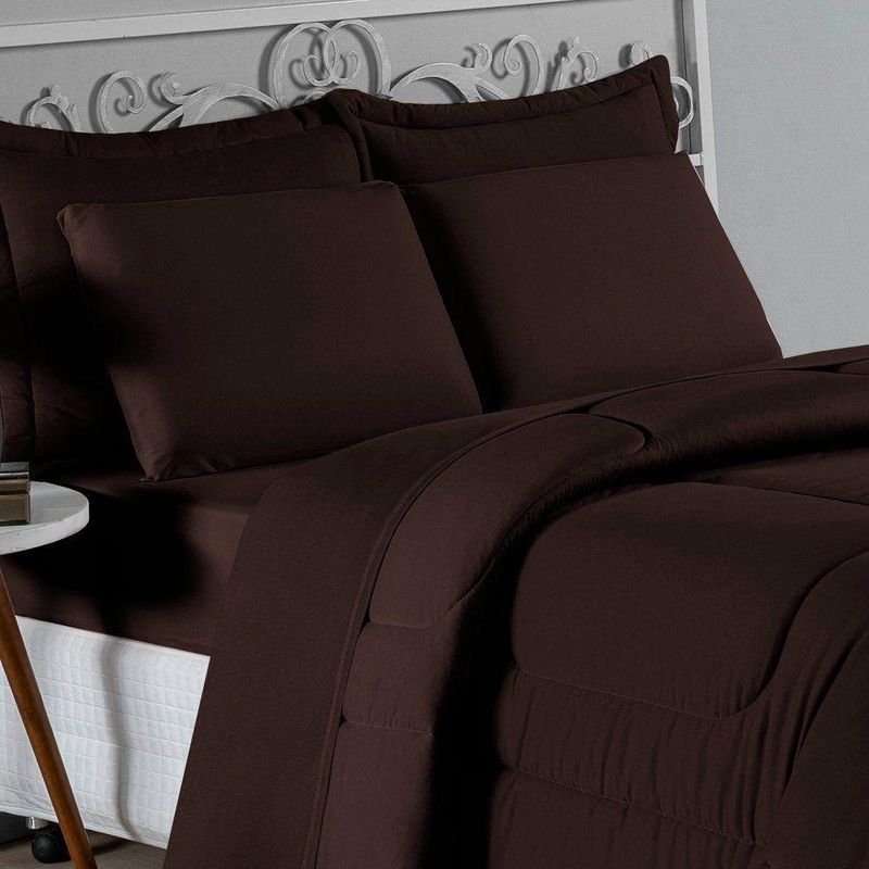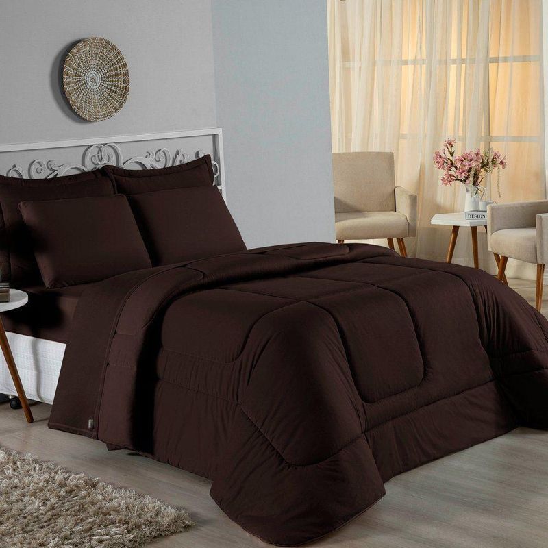 Kit Edredom Dupla Face + Jogo De Lençol Solteiro Nobre 4 Peças Malha 100% Algodão - MarromRenove o quarto das crianças ou de visitas com o Kit Cama Completa Solteiro Nobre 4 Peças. Uma solução prática e extremamente confortável que une o aquecimento do edredom, a elegância do porta travesseiro matelado e a suavidade do jogo de lençol em malha 100% algodão.Por que este Kit é uma ótima escolha?- Conforto da Malha Penteada: Todas as peças em contato com a pele são feitas em Malha 100% Algodão Fio 30/1 Penteado, garantindo toque macio, frescor e alta durabilidade sem formar bolinhas.- Cama Posta Coordenada: O kit já vem combinando! O edredom dupla face e o porta travesseiro decoram, enquanto o lençol e a fronha vestem o colchão com perfeição.- Praticidade do Elástico: O lençol de baixo possui elástico em toda a volta, facilitando a arrumação diária e garantindo que ele não escape do colchão.- Aconchego Térmico: O edredom com enchimento siliconado oferece o peso e o calor ideais para uma noite de sono tranquila.Produto composto por (Total 04 Peças):Do Kit Edredom (02 Peças):01 Edredom Solteiro Dupla Face: 1,60m x 2,40m01 Porta Travesseiro Matelado: 50cm x 70cmDo Jogo de Lençol (02 Peças):01 Lençol de Baixo com Elástico: 1,88m x 88cm x 30cm01 Fronha: 70cm x 50cmAtenção: Este kit é composto pelo jogo de cama essencial (lençol com elástico e fronha) e não inclui o lençol de cima (sobre lençol).Composição:Tecido (Todas as peças): Malha 100% Algodão - Fio 30/1 PenteadoEnchimento (Edredom e Porta Travesseiro): 100% Poliéster (Edredom com fibra siliconada)Forro (Apenas Porta Travesseiro): 100% Polipropileno