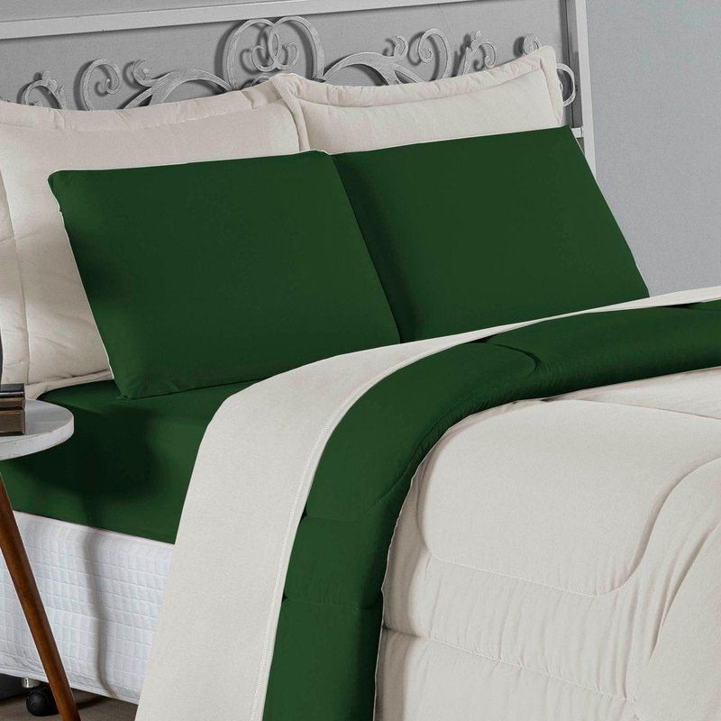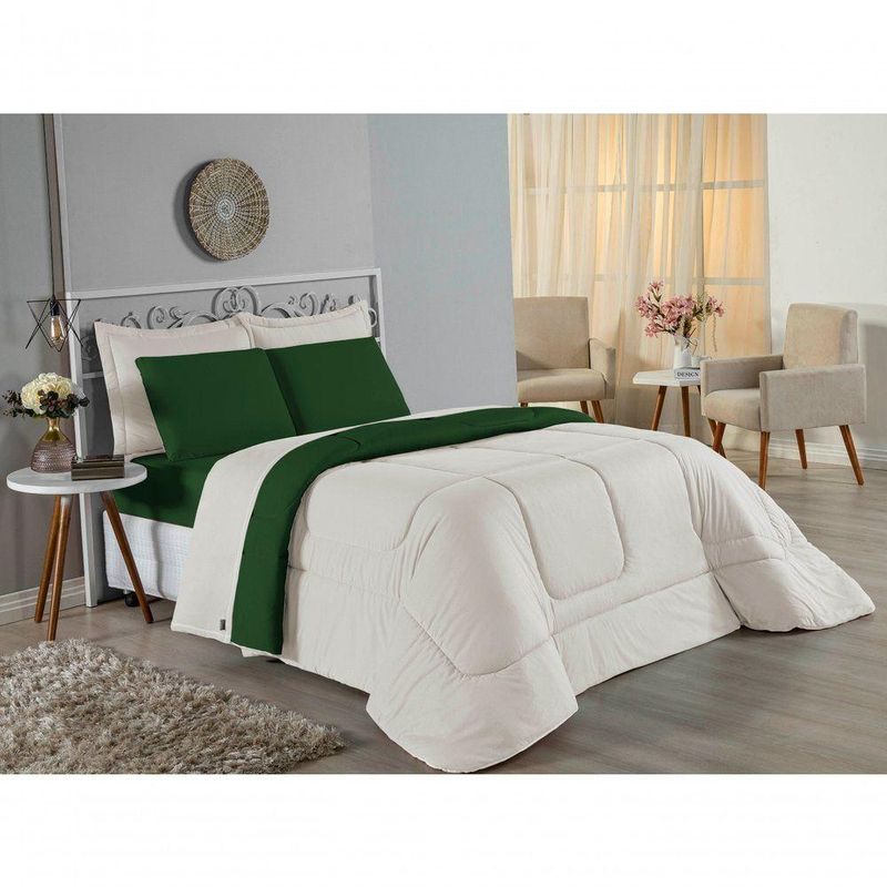 Kit Edredom Dupla Face + Jogo De Lençol Solteiro Nobre 4 Peças Malha 100% Algodão - Palha / Verde-bandeiraRenove o quarto das crianças ou de visitas com o Kit Cama Completa Solteiro Nobre 4 Peças. Uma solução prática e extremamente confortável que une o aquecimento do edredom, a elegância do porta travesseiro matelado e a suavidade do jogo de lençol em malha 100% algodão.Por que este Kit é uma ótima escolha?- Conforto da Malha Penteada: Todas as peças em contato com a pele são feitas em Malha 100% Algodão Fio 30/1 Penteado, garantindo toque macio, frescor e alta durabilidade sem formar bolinhas.- Cama Posta Coordenada: O kit já vem combinando! O edredom dupla face e o porta travesseiro decoram, enquanto o lençol e a fronha vestem o colchão com perfeição.- Praticidade do Elástico: O lençol de baixo possui elástico em toda a volta, facilitando a arrumação diária e garantindo que ele não escape do colchão.- Aconchego Térmico: O edredom com enchimento siliconado oferece o peso e o calor ideais para uma noite de sono tranquila.Produto composto por (Total 04 Peças):Do Kit Edredom (02 Peças):01 Edredom Solteiro Dupla Face: 1,60m x 2,40m01 Porta Travesseiro Matelado: 50cm x 70cmDo Jogo de Lençol (02 Peças):01 Lençol de Baixo com Elástico: 1,88m x 88cm x 30cm01 Fronha: 70cm x 50cmAtenção: Este kit é composto pelo jogo de cama essencial (lençol com elástico e fronha) e não inclui o lençol de cima (sobre lençol).Composição:Tecido (Todas as peças): Malha 100% Algodão - Fio 30/1 PenteadoEnchimento (Edredom e Porta Travesseiro): 100% Poliéster (Edredom com fibra siliconada)Forro (Apenas Porta Travesseiro): 100% Polipropileno