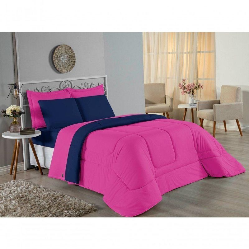 Kit Edredom Dupla Face + Jogo De Lençol Solteiro Nobre 4 Peças Malha 100% Algodão - Pink / Azul-marinhoRenove o quarto das crianças ou de visitas com o Kit Cama Completa Solteiro Nobre 4 Peças. Uma solução prática e extremamente confortável que une o aquecimento do edredom, a elegância do porta travesseiro matelado e a suavidade do jogo de lençol em malha 100% algodão.Por que este Kit é uma ótima escolha?- Conforto da Malha Penteada: Todas as peças em contato com a pele são feitas em Malha 100% Algodão Fio 30/1 Penteado, garantindo toque macio, frescor e alta durabilidade sem formar bolinhas.- Cama Posta Coordenada: O kit já vem combinando! O edredom dupla face e o porta travesseiro decoram, enquanto o lençol e a fronha vestem o colchão com perfeição.- Praticidade do Elástico: O lençol de baixo possui elástico em toda a volta, facilitando a arrumação diária e garantindo que ele não escape do colchão.- Aconchego Térmico: O edredom com enchimento siliconado oferece o peso e o calor ideais para uma noite de sono tranquila.Produto composto por (Total 04 Peças):Do Kit Edredom (02 Peças):01 Edredom Solteiro Dupla Face: 1,60m x 2,40m01 Porta Travesseiro Matelado: 50cm x 70cmDo Jogo de Lençol (02 Peças):01 Lençol de Baixo com Elástico: 1,88m x 88cm x 30cm01 Fronha: 70cm x 50cmAtenção: Este kit é composto pelo jogo de cama essencial (lençol com elástico e fronha) e não inclui o lençol de cima (sobre lençol).Composição:Tecido (Todas as peças): Malha 100% Algodão - Fio 30/1 PenteadoEnchimento (Edredom e Porta Travesseiro): 100% Poliéster (Edredom com fibra siliconada)Forro (Apenas Porta Travesseiro): 100% Polipropileno