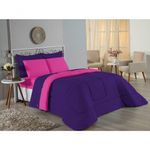 Kit Edredom Dupla Face + Jogo De Lençol Solteiro Nobre 4 Peças Malha 100% Algodão - Roxo / PinkRenove o quarto das crianças ou de visitas com o Kit Cama Completa Solteiro Nobre 4 Peças. Uma solução prática e extremamente confortável que une o aquecimento do edredom, a elegância do porta travesseiro matelado e a suavidade do jogo de lençol em malha 100% algodão.Por que este Kit é uma ótima escolha?- Conforto da Malha Penteada: Todas as peças em contato com a pele são feitas em Malha 100% Algodão Fio 30/1 Penteado, garantindo toque macio, frescor e alta durabilidade sem formar bolinhas.- Cama Posta Coordenada: O kit já vem combinando! O edredom dupla face e o porta travesseiro decoram, enquanto o lençol e a fronha vestem o colchão com perfeição.- Praticidade do Elástico: O lençol de baixo possui elástico em toda a volta, facilitando a arrumação diária e garantindo que ele não escape do colchão.- Aconchego Térmico: O edredom com enchimento siliconado oferece o peso e o calor ideais para uma noite de sono tranquila.Produto composto por (Total 04 Peças):Do Kit Edredom (02 Peças):01 Edredom Solteiro Dupla Face: 1,60m x 2,40m01 Porta Travesseiro Matelado: 50cm x 70cmDo Jogo de Lençol (02 Peças):01 Lençol de Baixo com Elástico: 1,88m x 88cm x 30cm01 Fronha: 70cm x 50cmAtenção: Este kit é composto pelo jogo de cama essencial (lençol com elástico e fronha) e não inclui o lençol de cima (sobre lençol).Composição:Tecido (Todas as peças): Malha 100% Algodão - Fio 30/1 PenteadoEnchimento (Edredom e Porta Travesseiro): 100% Poliéster (Edredom com fibra siliconada)Forro (Apenas Porta Travesseiro): 100% Polipropileno