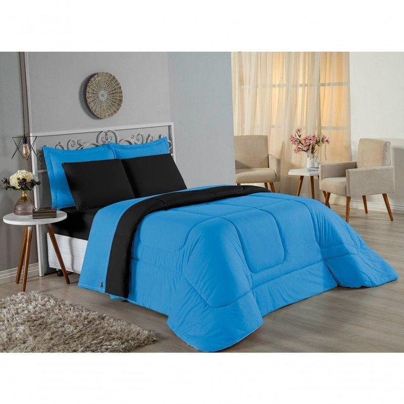 Kit Edredom Dupla Face + Jogo De Lençol Solteiro Nobre 4 Peças Malha 100% Algodão - Turquesa / PretoRenove o quarto das crianças ou de visitas com o Kit Cama Completa Solteiro Nobre 4 Peças. Uma solução prática e extremamente confortável que une o aquecimento do edredom, a elegância do porta travesseiro matelado e a suavidade do jogo de lençol em malha 100% algodão.Por que este Kit é uma ótima escolha?- Conforto da Malha Penteada: Todas as peças em contato com a pele são feitas em Malha 100% Algodão Fio 30/1 Penteado, garantindo toque macio, frescor e alta durabilidade sem formar bolinhas.- Cama Posta Coordenada: O kit já vem combinando! O edredom dupla face e o porta travesseiro decoram, enquanto o lençol e a fronha vestem o colchão com perfeição.- Praticidade do Elástico: O lençol de baixo possui elástico em toda a volta, facilitando a arrumação diária e garantindo que ele não escape do colchão.- Aconchego Térmico: O edredom com enchimento siliconado oferece o peso e o calor ideais para uma noite de sono tranquila.Produto composto por (Total 04 Peças):Do Kit Edredom (02 Peças):01 Edredom Solteiro Dupla Face: 1,60m x 2,40m01 Porta Travesseiro Matelado: 50cm x 70cmDo Jogo de Lençol (02 Peças):01 Lençol de Baixo com Elástico: 1,88m x 88cm x 30cm01 Fronha: 70cm x 50cmAtenção: Este kit é composto pelo jogo de cama essencial (lençol com elástico e fronha) e não inclui o lençol de cima (sobre lençol).Composição:Tecido (Todas as peças): Malha 100% Algodão - Fio 30/1 PenteadoEnchimento (Edredom e Porta Travesseiro): 100% Poliéster (Edredom com fibra siliconada)Forro (Apenas Porta Travesseiro): 100% Polipropileno