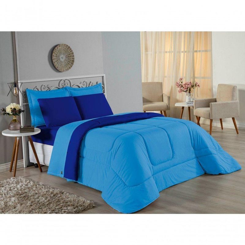Kit Edredom Dupla Face + Jogo De Lençol Solteiro Nobre 4 Peças Malha 100% Algodão - Turquesa / RoyalRenove o quarto das crianças ou de visitas com o Kit Cama Completa Solteiro Nobre 4 Peças. Uma solução prática e extremamente confortável que une o aquecimento do edredom, a elegância do porta travesseiro matelado e a suavidade do jogo de lençol em malha 100% algodão.Por que este Kit é uma ótima escolha?- Conforto da Malha Penteada: Todas as peças em contato com a pele são feitas em Malha 100% Algodão Fio 30/1 Penteado, garantindo toque macio, frescor e alta durabilidade sem formar bolinhas.- Cama Posta Coordenada: O kit já vem combinando! O edredom dupla face e o porta travesseiro decoram, enquanto o lençol e a fronha vestem o colchão com perfeição.- Praticidade do Elástico: O lençol de baixo possui elástico em toda a volta, facilitando a arrumação diária e garantindo que ele não escape do colchão.- Aconchego Térmico: O edredom com enchimento siliconado oferece o peso e o calor ideais para uma noite de sono tranquila.Produto composto por (Total 04 Peças):Do Kit Edredom (02 Peças):01 Edredom Solteiro Dupla Face: 1,60m x 2,40m01 Porta Travesseiro Matelado: 50cm x 70cmDo Jogo de Lençol (02 Peças):01 Lençol de Baixo com Elástico: 1,88m x 88cm x 30cm01 Fronha: 70cm x 50cmAtenção: Este kit é composto pelo jogo de cama essencial (lençol com elástico e fronha) e não inclui o lençol de cima (sobre lençol).Composição:Tecido (Todas as peças): Malha 100% Algodão - Fio 30/1 PenteadoEnchimento (Edredom e Porta Travesseiro): 100% Poliéster (Edredom com fibra siliconada)Forro (Apenas Porta Travesseiro): 100% Polipropileno
