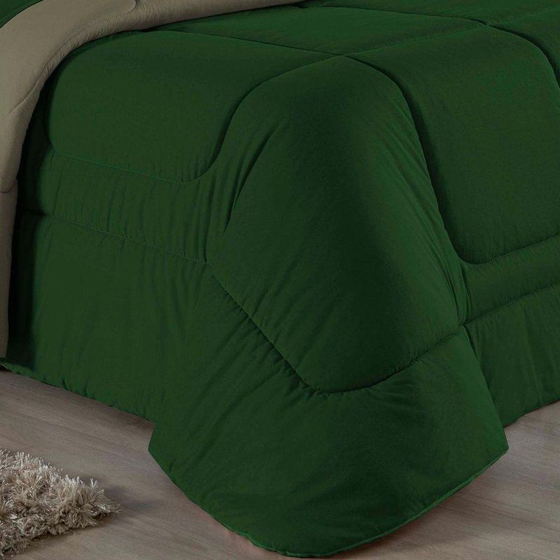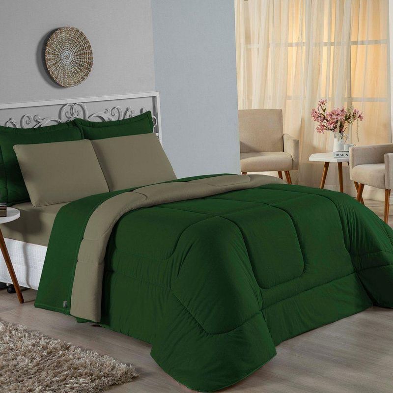 Kit Edredom Dupla Face + Jogo De Lençol Solteiro Nobre 4 Peças Malha 100% Algodão - Verde-bandeira / AvelãRenove o quarto das crianças ou de visitas com o Kit Cama Completa Solteiro Nobre 4 Peças. Uma solução prática e extremamente confortável que une o aquecimento do edredom, a elegância do porta travesseiro matelado e a suavidade do jogo de lençol em malha 100% algodão.Por que este Kit é uma ótima escolha?- Conforto da Malha Penteada: Todas as peças em contato com a pele são feitas em Malha 100% Algodão Fio 30/1 Penteado, garantindo toque macio, frescor e alta durabilidade sem formar bolinhas.- Cama Posta Coordenada: O kit já vem combinando! O edredom dupla face e o porta travesseiro decoram, enquanto o lençol e a fronha vestem o colchão com perfeição.- Praticidade do Elástico: O lençol de baixo possui elástico em toda a volta, facilitando a arrumação diária e garantindo que ele não escape do colchão.- Aconchego Térmico: O edredom com enchimento siliconado oferece o peso e o calor ideais para uma noite de sono tranquila.Produto composto por (Total 04 Peças):Do Kit Edredom (02 Peças):01 Edredom Solteiro Dupla Face: 1,60m x 2,40m01 Porta Travesseiro Matelado: 50cm x 70cmDo Jogo de Lençol (02 Peças):01 Lençol de Baixo com Elástico: 1,88m x 88cm x 30cm01 Fronha: 70cm x 50cmAtenção: Este kit é composto pelo jogo de cama essencial (lençol com elástico e fronha) e não inclui o lençol de cima (sobre lençol).Composição:Tecido (Todas as peças): Malha 100% Algodão - Fio 30/1 PenteadoEnchimento (Edredom e Porta Travesseiro): 100% Poliéster (Edredom com fibra siliconada)Forro (Apenas Porta Travesseiro): 100% Polipropileno