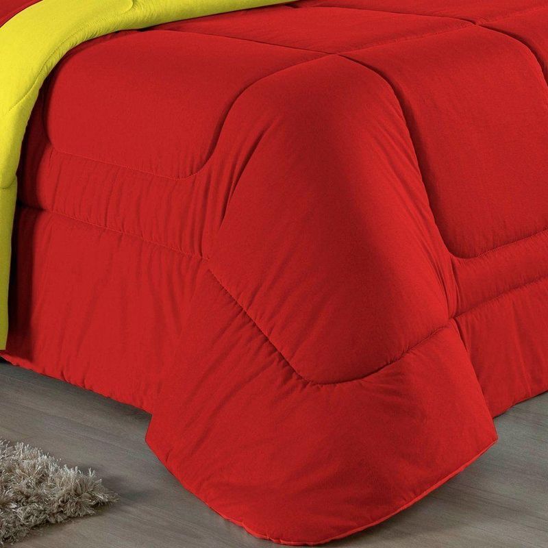 Kit Edredom Dupla Face + Jogo De Lençol Solteiro Nobre 4 Peças Malha 100% Algodão - Vermelho / AmareloRenove o quarto das crianças ou de visitas com o Kit Cama Completa Solteiro Nobre 4 Peças. Uma solução prática e extremamente confortável que une o aquecimento do edredom, a elegância do porta travesseiro matelado e a suavidade do jogo de lençol em malha 100% algodão.Por que este Kit é uma ótima escolha?- Conforto da Malha Penteada: Todas as peças em contato com a pele são feitas em Malha 100% Algodão Fio 30/1 Penteado, garantindo toque macio, frescor e alta durabilidade sem formar bolinhas.- Cama Posta Coordenada: O kit já vem combinando! O edredom dupla face e o porta travesseiro decoram, enquanto o lençol e a fronha vestem o colchão com perfeição.- Praticidade do Elástico: O lençol de baixo possui elástico em toda a volta, facilitando a arrumação diária e garantindo que ele não escape do colchão.- Aconchego Térmico: O edredom com enchimento siliconado oferece o peso e o calor ideais para uma noite de sono tranquila.Produto composto por (Total 04 Peças):Do Kit Edredom (02 Peças):01 Edredom Solteiro Dupla Face: 1,60m x 2,40m01 Porta Travesseiro Matelado: 50cm x 70cmDo Jogo de Lençol (02 Peças):01 Lençol de Baixo com Elástico: 1,88m x 88cm x 30cm01 Fronha: 70cm x 50cmAtenção: Este kit é composto pelo jogo de cama essencial (lençol com elástico e fronha) e não inclui o lençol de cima (sobre lençol).Composição:Tecido (Todas as peças): Malha 100% Algodão - Fio 30/1 PenteadoEnchimento (Edredom e Porta Travesseiro): 100% Poliéster (Edredom com fibra siliconada)Forro (Apenas Porta Travesseiro): 100% Polipropileno