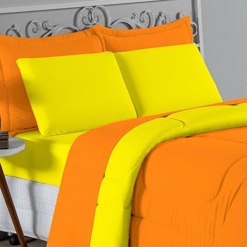 Kit Edredom Dupla Face + Jogo De Lençol Solteiro Nobre 5 Peças Malha 100% Algodão - Laranja / AmareloGaranta a experiência completa de conforto e decoração com o Kit Cama Completa Solteiro Nobre 5 Peças. Este conjunto premium inclui todas as peças necessárias para vestir a cama, do lençol de cima ao edredom, tudo em malha 100% algodão.Por que este Kit é uma ótima escolha?- Enxoval Completo: Diferente dos kits básicos, este modelo inclui o Lençol de Cima, ideal para dias frescos e para proteger o edredom, garantindo higiene e conforto térmico.- Qualidade da Malha: Feito em 100% Algodão Fio 30/1 Penteado, oferece toque macio, não dá bolinhas e é altamente respirável.- Decoração Impecável: O edredom dupla face e o porta travesseiro matelado decoram a cama, enquanto o jogo de lençóis completo traz a sensação de cama de hotel.- Ajuste Seguro: O lençol de baixo com elástico fixa-se firmemente ao colchão solteiro.Produto composto por (Total 05 Peças):Do Kit Edredom (02 Peças):01 Edredom Solteiro Dupla Face: 1,60m x 2,40m01 Porta Travesseiro Matelado: 50cm x 70cmDo Jogo de Lençol (03 Peças):01 Lençol de Cima (Virol): 1,60m x 2,40m01 Lençol de Baixo com Elástico: 1,88m x 88cm x 30cm01 Fronha: 70cm x 50cmComposição:Tecido (Todas as peças): Malha 100% Algodão - Fio 30/1 PenteadoEnchimento (Edredom e Porta Travesseiro): 100% Poliéster (Edredom com fibra siliconada)Forro (Apenas Porta Travesseiro): 100% Polipropileno