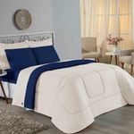 Kit Edredom Dupla Face + Jogo De Lençol Solteiro Nobre 5 Peças Malha 100% Algodão - Palha / Azul-marinhoGaranta a experiência completa de conforto e decoração com o Kit Cama Completa Solteiro Nobre 5 Peças. Este conjunto premium inclui todas as peças necessárias para vestir a cama, do lençol de cima ao edredom, tudo em malha 100% algodão.Por que este Kit é uma ótima escolha?- Enxoval Completo: Diferente dos kits básicos, este modelo inclui o Lençol de Cima, ideal para dias frescos e para proteger o edredom, garantindo higiene e conforto térmico.- Qualidade da Malha: Feito em 100% Algodão Fio 30/1 Penteado, oferece toque macio, não dá bolinhas e é altamente respirável.- Decoração Impecável: O edredom dupla face e o porta travesseiro matelado decoram a cama, enquanto o jogo de lençóis completo traz a sensação de cama de hotel.- Ajuste Seguro: O lençol de baixo com elástico fixa-se firmemente ao colchão solteiro.Produto composto por (Total 05 Peças):Do Kit Edredom (02 Peças):01 Edredom Solteiro Dupla Face: 1,60m x 2,40m01 Porta Travesseiro Matelado: 50cm x 70cmDo Jogo de Lençol (03 Peças):01 Lençol de Cima (Virol): 1,60m x 2,40m01 Lençol de Baixo com Elástico: 1,88m x 88cm x 30cm01 Fronha: 70cm x 50cmComposição:Tecido (Todas as peças): Malha 100% Algodão - Fio 30/1 PenteadoEnchimento (Edredom e Porta Travesseiro): 100% Poliéster (Edredom com fibra siliconada)Forro (Apenas Porta Travesseiro): 100% Polipropileno